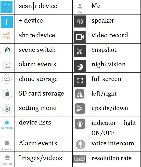 Сканирование + устройство + Устройство Совместно используемое устройство Переключатель сцены Тревожные события Облачное хранилище Устройство для хранения sd-карт Настройка меню Списки устройств Тревожные события Изображения/видео Меня Динамик Запись видео Снимок Ночное видение Полный экран Влево/вправо Вверх/вниз Светильник индикатора ВКЛ/ВЫКЛ Голосовая Интерком Скорость разрешения