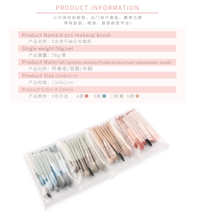 Категория продукта: Кисть для макияжа/набор кистей для макияжа Количество кистей: 8 Материал щетины: искусственное волокно Тип кисти: opp Материал ручки кисти: деревянная ручка Характеристики ручки кисти: портативный Характеристики длины волос: 3,5 см Общая длина характеристики: 9 см Применимые люди: общие Вес одного продукта: 58 г/компл. Спецификация: 13*9*2 см EVA водонепроницаемая сумка Материал: алюминиевая трубка/деревянная ручка/химическое волокно Описание: четыре цвета, 8 различных форм головки кисти. Подходит для пудры, румян, основы, теней для век, бровей, губ, лишнего порошка и других глаз, макияжа лица! Мужские волокна волос! Легкий и удобный