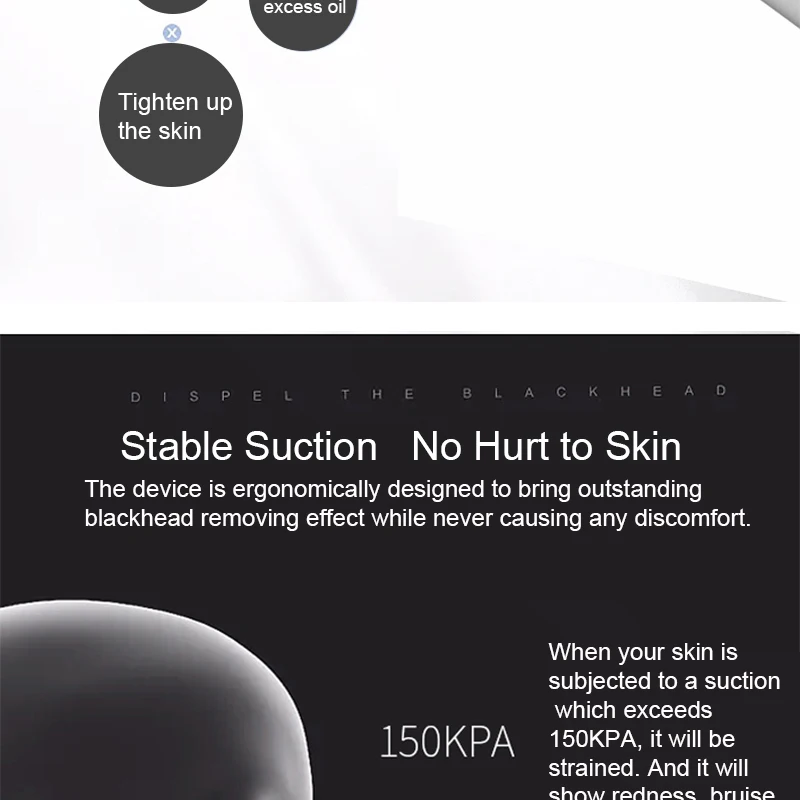 Продукт Особенности · Очистите поры: эффективно удаляет черные точки, грязь, масло, остатки макияжа из пор · Омолаживает кожу: отшелушивает омертвевшие клетки кожи с поверхности кожи для более раннего лица Укрепляющая кожа: подтягивает кожу, улучшает провисание, Уменьшает мелкие морщины · Beauсветильник Light: помогает успокаивать и успокаивать кожу, сужает поры для более гладкого вида · Светодиодный экран: четко показывает режимы и Время работы батареи, делает использование более удобным · Продолжительный аккумулятор: аккумулятор 600 мА · ч поддерживает использование на одной зарядке около 3 недель Методы зарядки 1. Символ батареи мигает, когда батарея разряжена, что напоминает вам о необходимости зарядки устройства. 2. Подключите устройство к адаптеру 5 В/1 А (не входит в комплект) через зарядный кабель. Подключите к розетке и зарядка начинается. 3. Светодиодный экран будет светильник и символ батареи будет прокрутки во время зарядки. Символ твердой батареи означает, что зарядка закончена. Технические характеристики Название: инструмент для удаления чёрных точек с синим светильник Метод зарядки: Проводная зарядка Емкость батареи: 600 мАч "Непрерывное время работы (без нагрузки): Мягкий ≈ 2,5 H; Нормальные ≈ 2H; Сильный ≈ 1,5 H" Напряжение аккумулятора: 3,7 в Напряжение зарядки: 5 В/1 А Номинальная выходная мощность: ≤ 2,5 Вт Номинальный ток: 500mA Индекс шума (лист) Давление (нагрузка): мягкое 60 ± 3 кПа; Нормальное 62 ± 3 кПа; Сильное 64 ± 3 кПа Посылка содержание 1 * инструмент для удаления чёрных точек с синим светильник 1 * большой круглый зонд 1 * небольшой круглый зонд 1 * Овальный зонд 1 * упаковка изоляционной колодки Зарядный кабель микро-USB 1 шт. 1 * Руководство пользователя