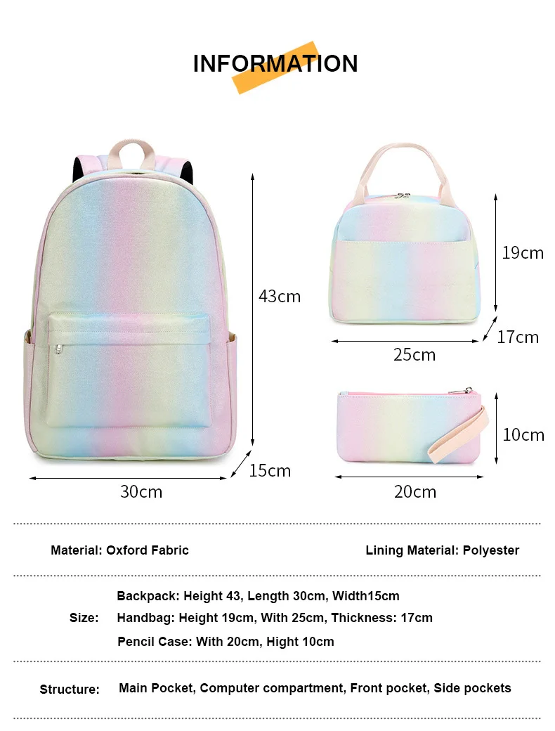 Размер рюкзака (приблизительно): длина 30 см; Ширина 15 см; Высота 43 см Материал: водонепроницаемый полиэстер Вес: 0,6 кг Применение: рюкзак для девочек Стиль: школьные сумки/Школьный рюкзак/сумка для ноутбука Посылка: 1x Рюкзак 1 сумка 1x чехол-карандаш 1. Примечания: замеры сделаны вручную, поэтому возможны отклонения на 1-3 см. 2. Все измерения в см, пожалуйста, обратите внимание, что 1 см = 0,3937 дюйма, 1 дюйм = 2,540 см