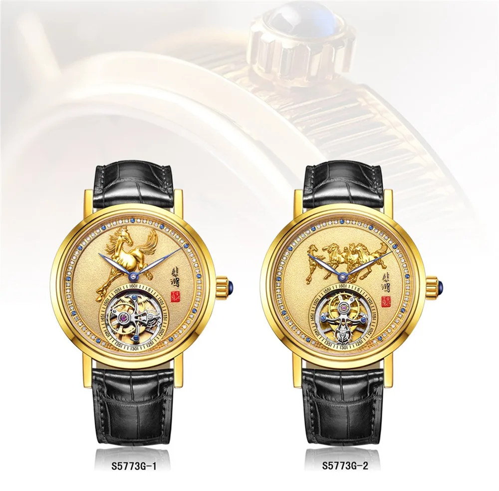 Циферблат: рельеф циферблата стереоскопическая Беговая лошадь покрыта чистым золотом, набор с 48 шт vvs натуральными бриллиантами, 12 шт. натуральные сапфиры