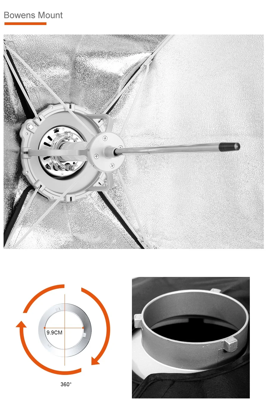 Бренд: Godox Модель: SB-UE Форма: восьмиугольник Тип крепления: крепление Bowens Размер софтбокса (диаметр): 80 см/31,5 дюйма Размер посылка: 20,5*16,5*66 см/8,1*6,5*26 дюймов Посылка, вес: 1,705 кг