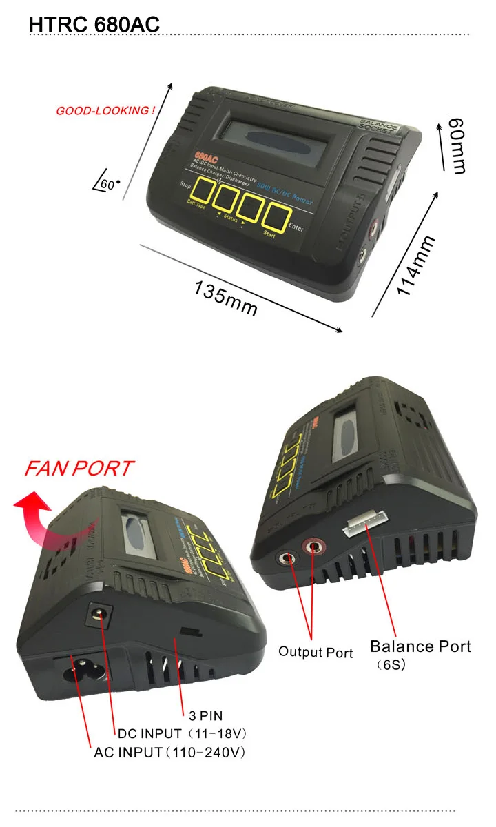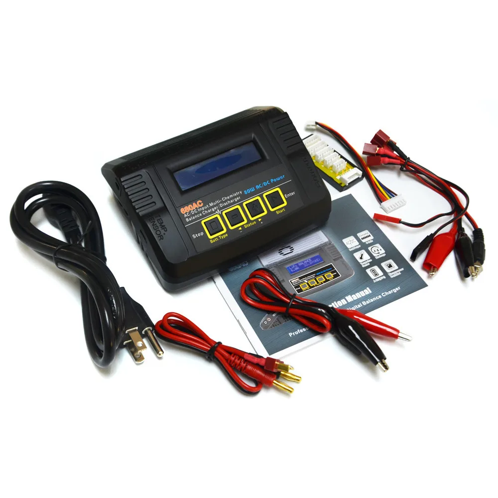 Характеристики: Входное напряжение: AC110-240V/DC11-18V Мощность цепи зарядного устройства: 80 Вт Схема разрядки: 10 Вт Диапазон тока зарядного устройства: 0,1-6A Диапазон разрядки тока: 0,1-2A Текущий дриан для балансировочного порта: 350 мА/ячейка Nicd/NiMh:1-15 ячеек LiPo/LiFe/Lilon:1-6 ячеек PB:2-20 в Деменция: L13.5 * W11.2 * h6 см