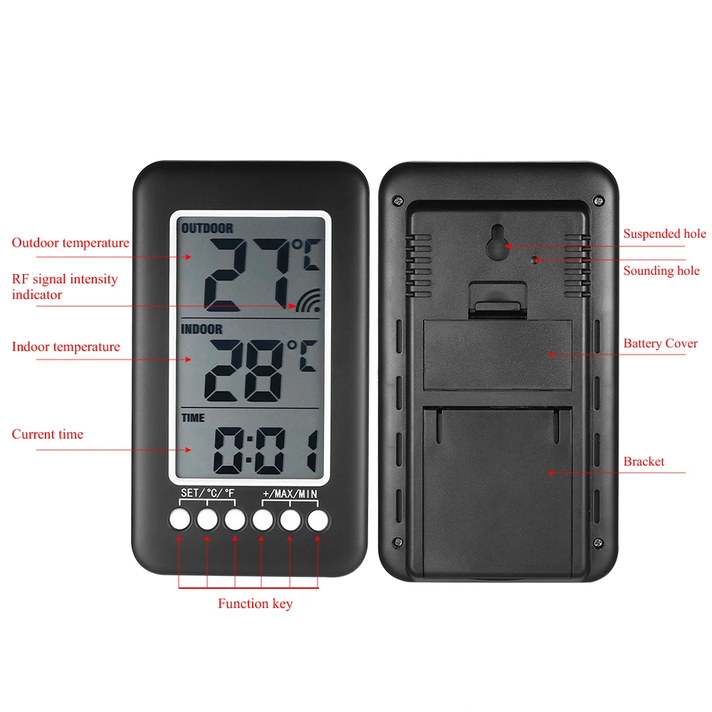 Функция: отображение времени, Внутренняя/наружная температура, переключение ℃/℉, формат времени 12H/24H, Раздельный передатчик