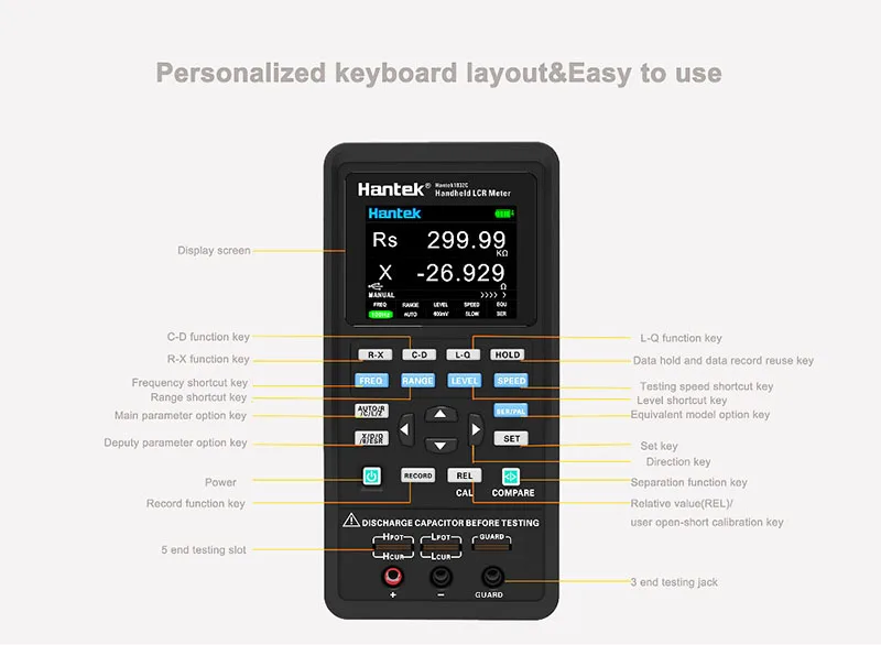 Hantek1832C/Hantek1833C handheld LCR Meter is a portable handheld measuring instrument to measure the parameters of the component such as inductance, capacitance, resistance and so on. small volume, powered by 5V lithium battery, it can meet the requirements of desktop LCR application, and can also be applied to flow measurement and handheld measurement.
