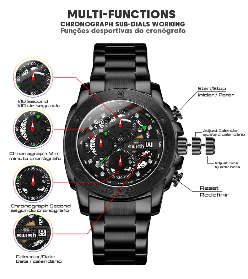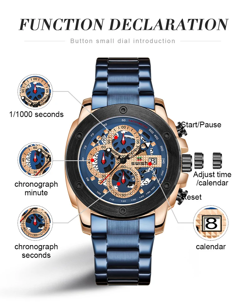 Бренд: SWISH Стиль: спортивный, Повседневный, деловой, модный Механизм: оригинальный кварцевый механизм Основная особенность * 100% новые и высококачественные ** 3 АТМ/30 М Водонепроницаемость (поддержка холодного душа и плавания, не используйте часы под водой, не поддерживайте горячую воду); *** Чехол из сплава; **** Качественная нержавеющая сталь 1 * набор = 1 * SWISH Watch + 1 * Подарочная коробка