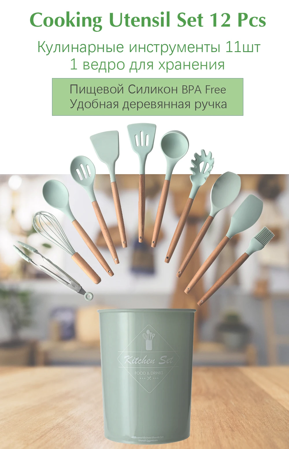 Набор силиконовых кухонных принадлежностей с антипригарной деревянной ручкой, лопатки, ковш, венчик, туннер с ведром для хранения, кухонная утварь, 11/12 шт.