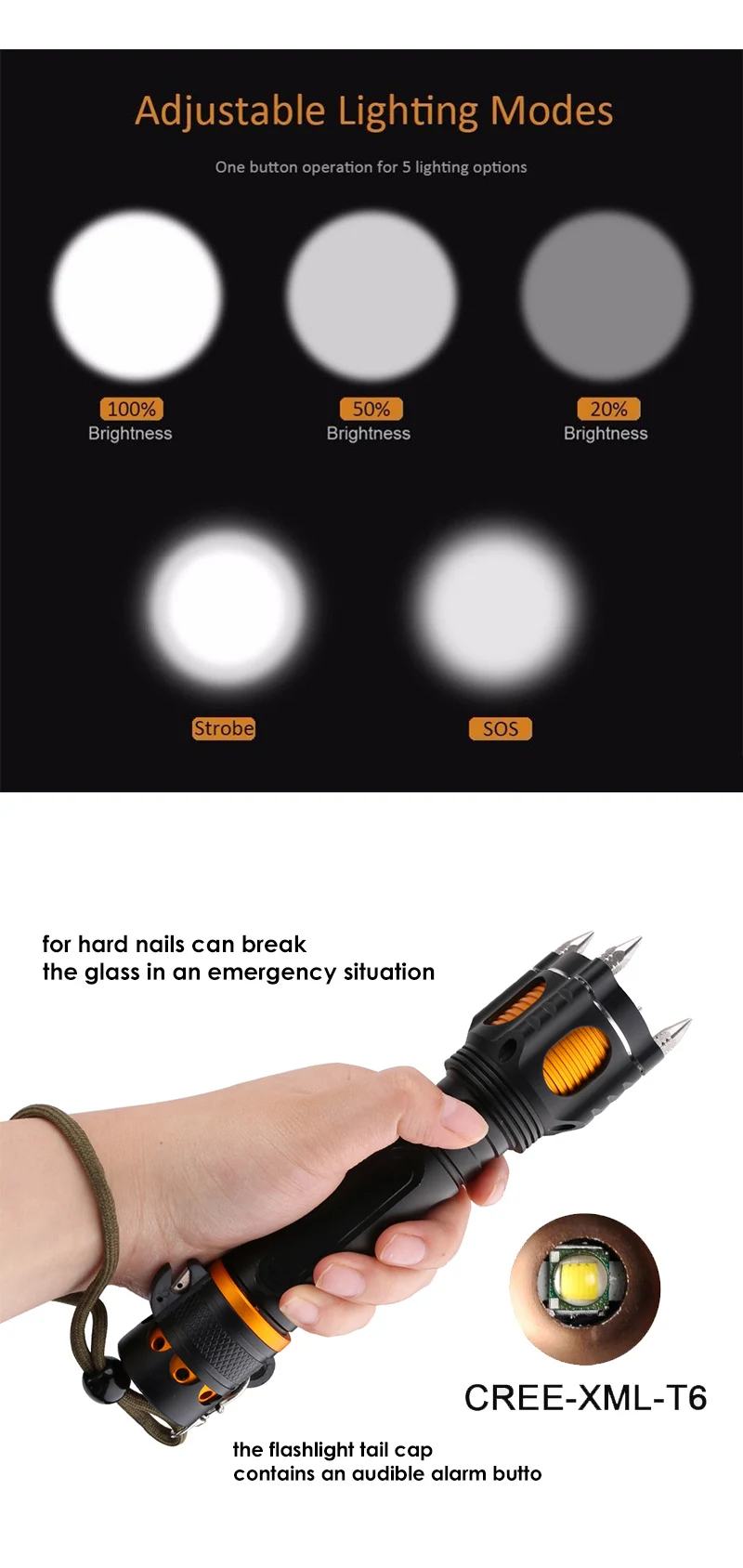 1. Авиационный материал из алюминиевого сплава, низкая плотность, высокая прочность; Вся лампа IP65 водонепроницаемая конструкция, используется для наружной и другой суровой среды; 2. Cree xml-t6, высокая яркость, срок службы до 100000 часов; 3. Он принимает дизайн оптической фокусировки Эмиссионного стакана, который является сильным в светильник и без бликов; 4,5 шаблоны освещения на выбор: высокий/средний/низкий/Стробоскоп/SOS; 5. Вся лампа питается от 1*18650 батареи; (не все спецификации включают батареи); 6. Головка фонарика с 4 головками из алюминиевого сплава, корпус лампы с режущего ножа, хвост с функцией звуковой сигнализации; Чехол для аварийной ситуации/выхода из строя, вы можете быть обеспечены адекватной защитой безопасности. Примечание: Более 95% покупателей предпочитают покупать комплект с аккумулятором и зарядным устройством, чтобы избежать некоторых проблем, которые стоят дорого и не могут быть куплены.