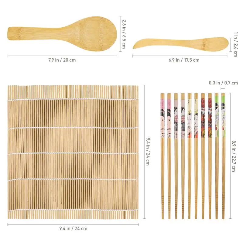 Вы не уверены, как легко сделать суши? Вы ищете полный набор для приготовления суши? Этот комплект должен быть вашим первым выбором. 15 штук набора для приготовления суши включает в себя 1 обертку для палочек, 2 мата, 1 весло, 5 пар палочек для еды и 1 разбрасыватель, которые изготовлены из высококачественного древесного материала, так что вы можете использовать, чтобы сделать суши без беспокойства.
