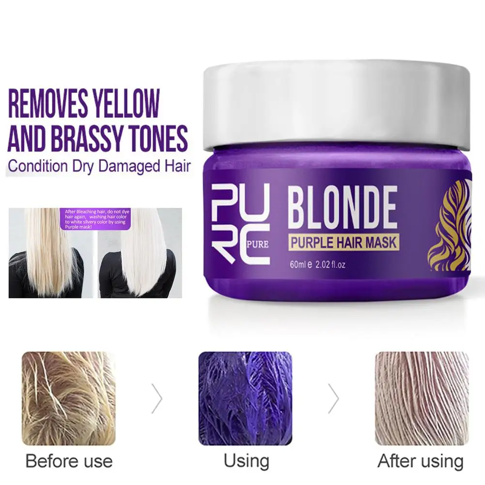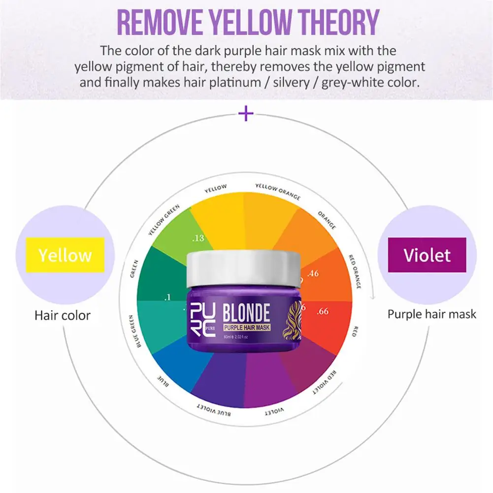 Сильные волосы темно-фиолетового цвета маскируют против желтых тонов волос, тем самым удаляя желтые тона и, наконец, делая волосы платиновыми/серебристыми/пепельными.