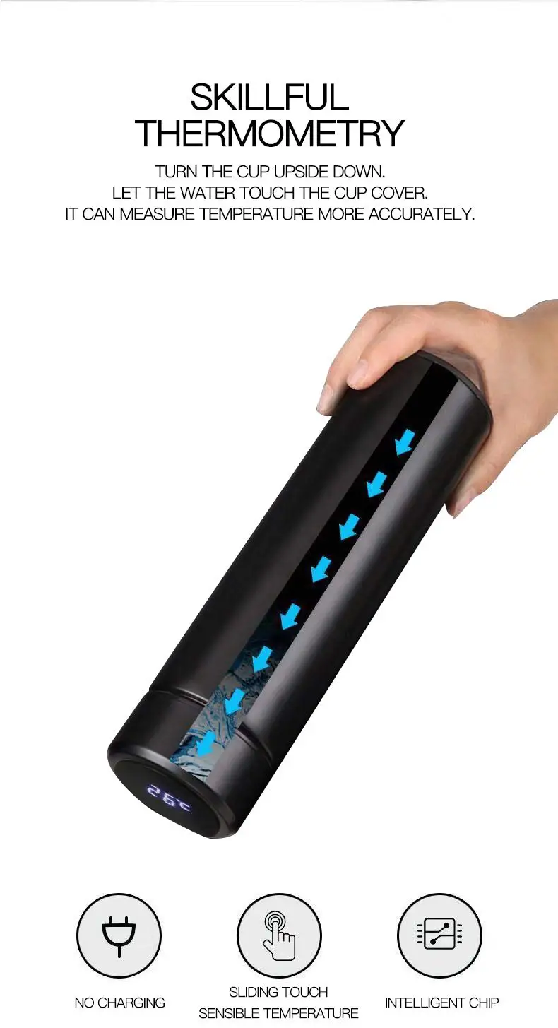 Эта бутылка нового стиля имеет светодиодный Интеллектуальный температурный дисплей в верхней части термоса, который прослужит до 80000 касаний без изменения батареи. Это 5 + лет использования! Тепло каждого момента вы можете увидеть, просто мягко прикоснувшись к верхней части термоса. Нажмите на верхнюю часть термоса мягко, чувствительная емкость сенсорного покрытия может показать температуру воды внутри термоса немедленно, что может избежать смущения при горении
