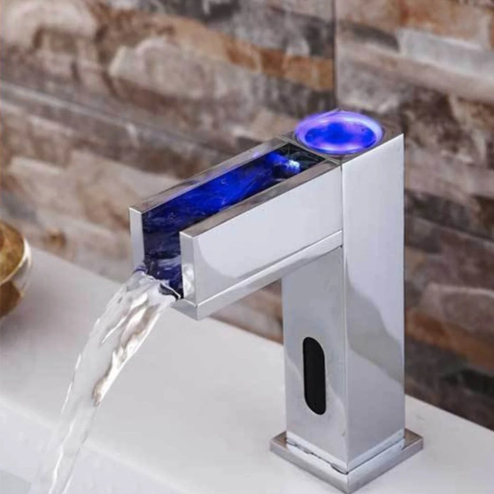 Автоматическая Сенсор Бесконтактный Кухня кран 3-Цвет светодиодный Температура чувствительный Ванная комната раковина кран Водопад Носик водяной кран из латуни