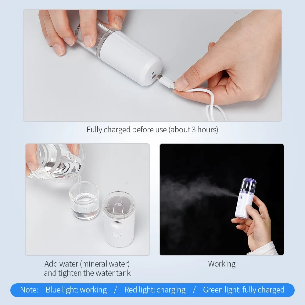 1. Используя технологию нано-распыления, чтобы сделать молекулы воды меньше, используя ультразвуковую технологию вибрации, чтобы разбивать молекулы воды в туман, кожа скорее впитывает влагу и быстро проникает в кожу. 2. Распыление от 1,25 до 1,45 мл/с быстро входит в базовый слой через поры кожи и быстро распыляется. 3. Емкость для хранения воды 30 мл для пополнения воды. 4. Небольшой размер, легко носить с собой, увлажняет и увлажняет в любое время и в любом месте, и не занимает место. 5.USB зарядка, мини размер и легкий, легко и удобно носить с собой или использовать. 6. Не шумит, не прерывается. Встроенный светодиодный ночник, теплее ночью. 7. Все вокруг пополнения воды, можно использовать на лице, руках, теле, волосах и т. д., уменьшая чувствительность кожи. 8. Эффективно проникает в кожу, выцветает мелкие линии, устраняет грязь, масло омертвевшей кожи; Освежает кожу, глубоко увлажняет и не сушит. 9. Все вокруг пополнения воды, можно использовать на лице, руках, теле, волосах и т. д., уменьшая чувствительность кожи.