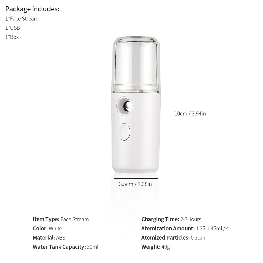 Тип изделия: лицевой поток Цвет: белый Материал: АБС-пластик Емкость резервуара для воды: 30 мл Время работы на одном заряде: 2-3Hours Количество распыления: 1,25-1,45 мл/с Распыленных частиц: 0.3μm Вес: 40 г Размеры: 3,5*10 см/1,38 * 3.94in