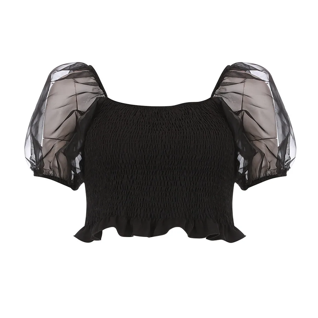 Особенности: воротник Aquare, сексуальный топОднотонная пикантная одежда из сетчатого материала, Короткий рукав, Пышный рукав, перспективный, стильный и модный дизайн, Летние повседневные топы.