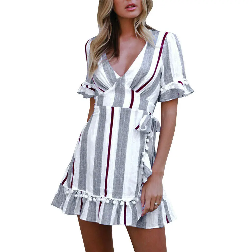 Женское летнее кружевное мини-платье в полоску с глубоким v-образным вырезом и глубоким вырезом на талии