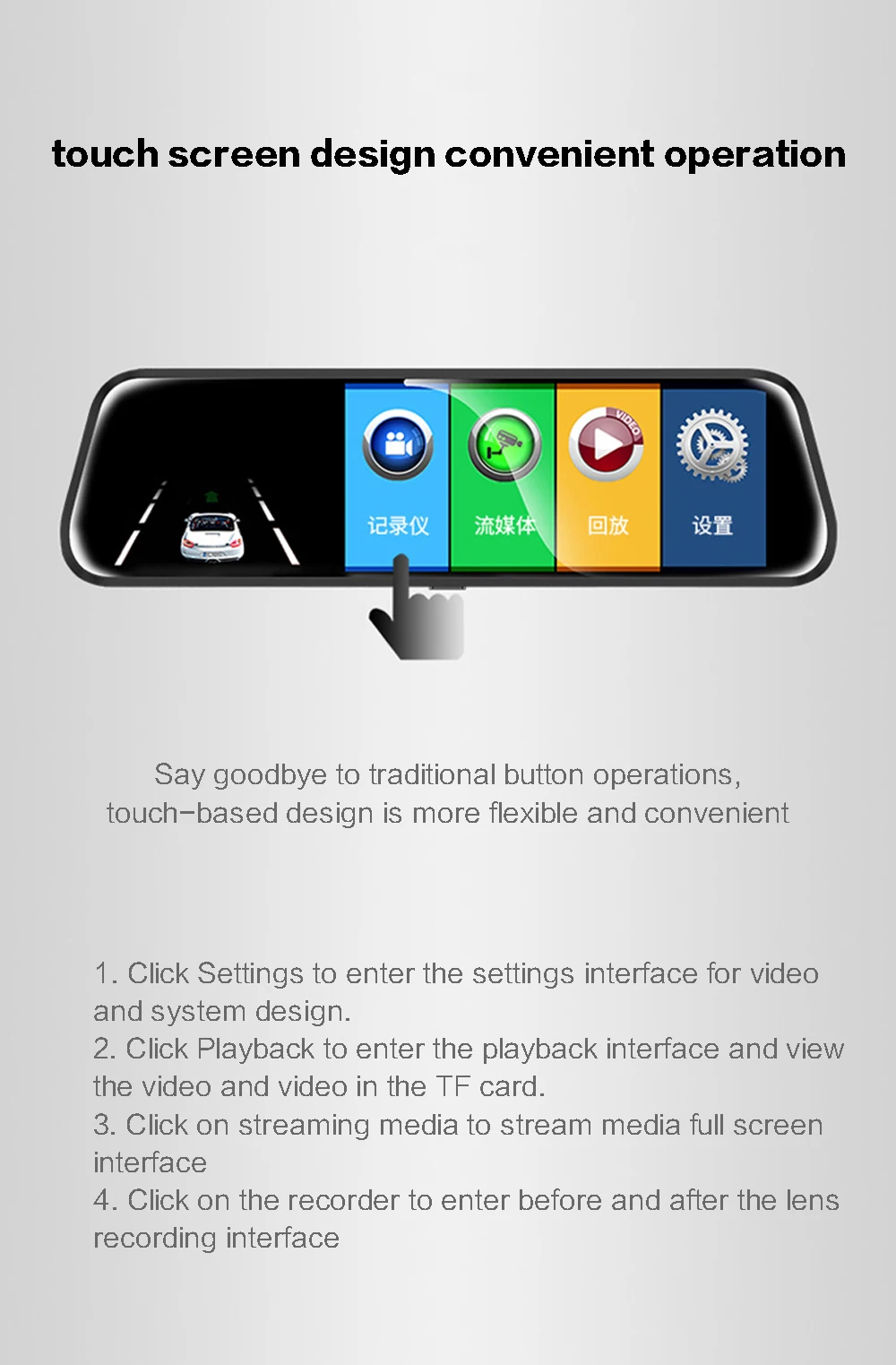Размер: Полноэкранный сенсорный экран 9,66 дюйма Размер внешнего вида: 308X88X18 (мм) Карта памяти: TF карта Угол съемки: 170 ° Пиксели: 12 миллионов Объем хранения данных: до 32 г Время хранения данных: циклическая запись Интерфейс передачи данных: USB / HDMI Скорость передачи: 3 м/с Место установки: зеркало заднего вида Мощность: прикуриватель Напряжение: 12В-24В Номинальный ток: 1A-2A Наличие карты памяти: не входит в комплект