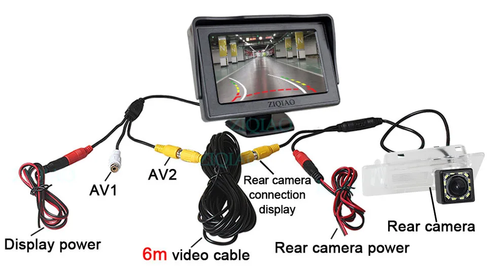 Камера и 4,3 дюймов зеркалом заднего вида монитор:Камера * 1+6 м кабель * 1 +Шнур питания * 2+ 4,3 дюймов Автомобильный монитор заднего вида * 1