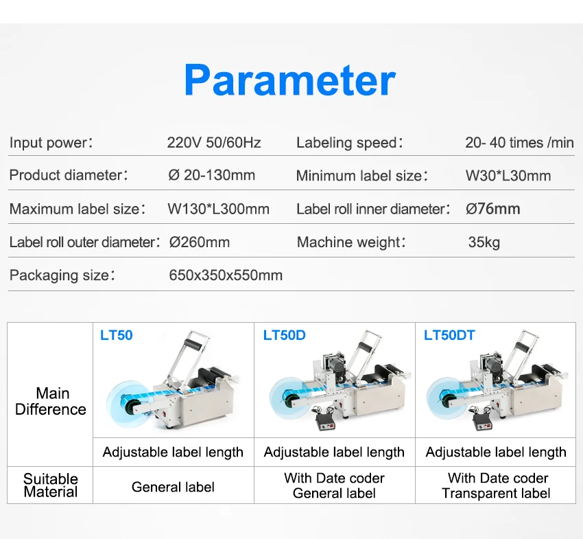 1.These two machine are designed for labeling on curved surface,LT-50D can not be used with transparent label, but LT-50DT can be used with it,click here know the LT-50DT