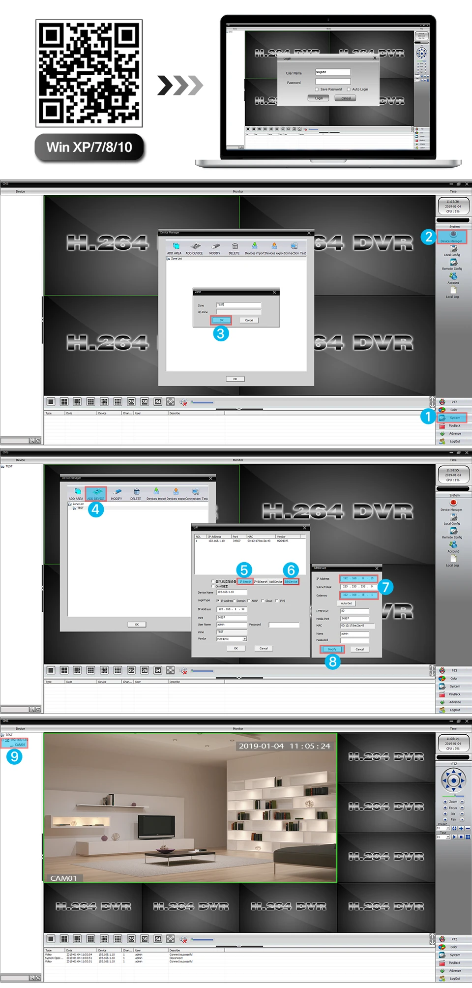 1: Загрузите клиент XMEYE CMS для windows из приведенного ниже qr-кода. 2: нажмите «Система»-«устройство»-«список зон»-«Добавить область». Укажите название зоны и нажмите ok. 3: Найдите ip-адрес, нажав на кнопку поиска или заполните все детали вручную и сохраните его.