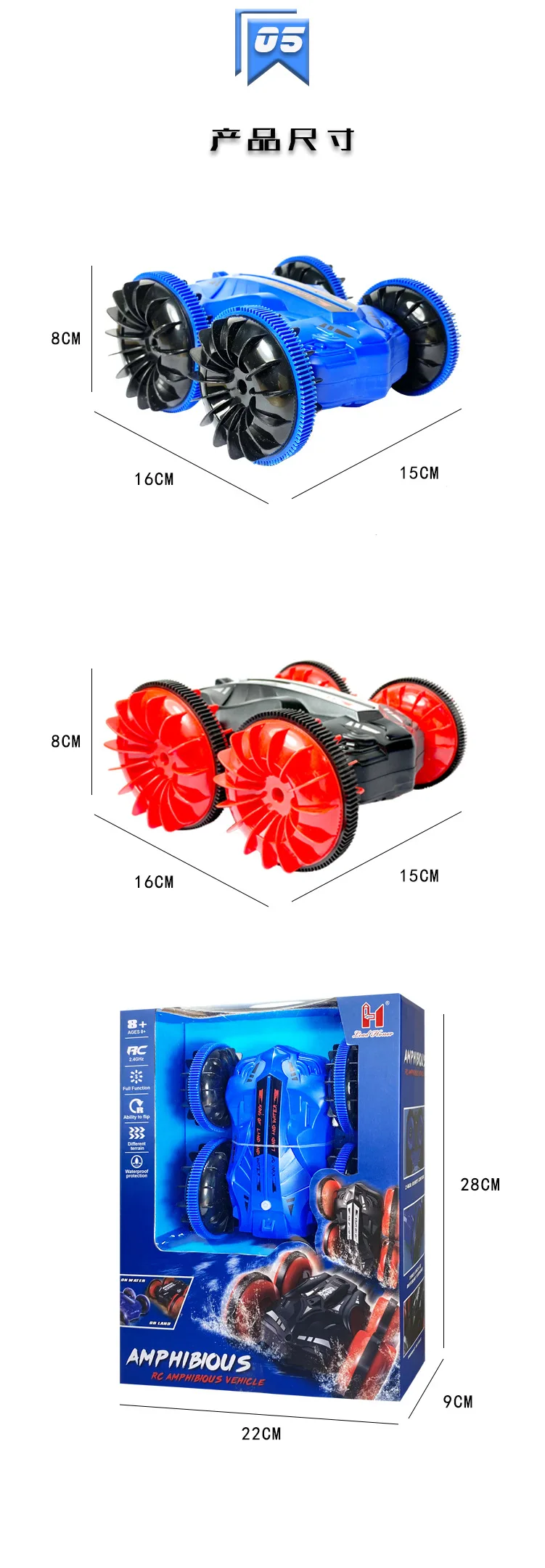 Автомобиль-амфибия с дистанционным управлением, четырехколесный привод, вперед и назад, поворот влево и вправо, поворот на месте, может быть перевернут.