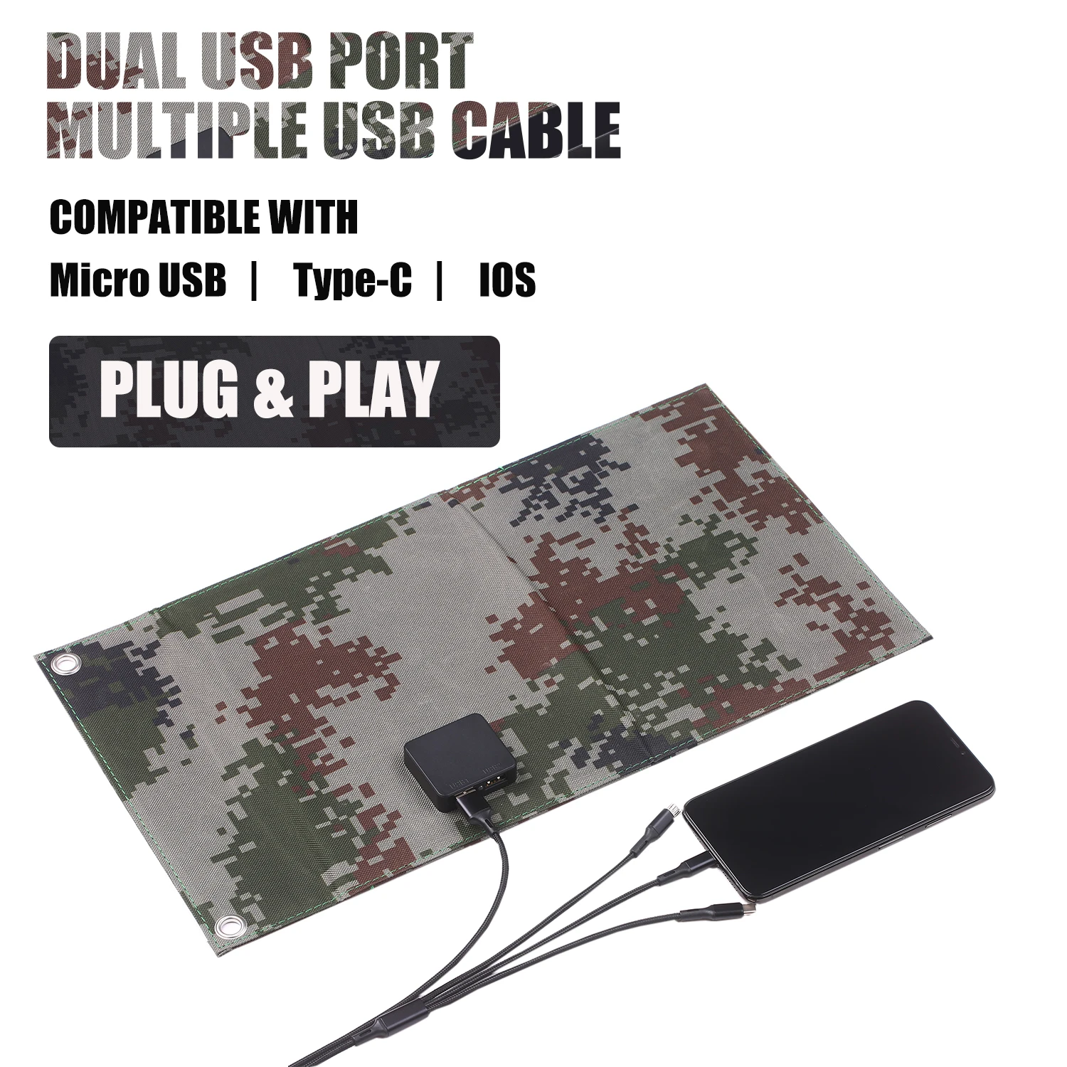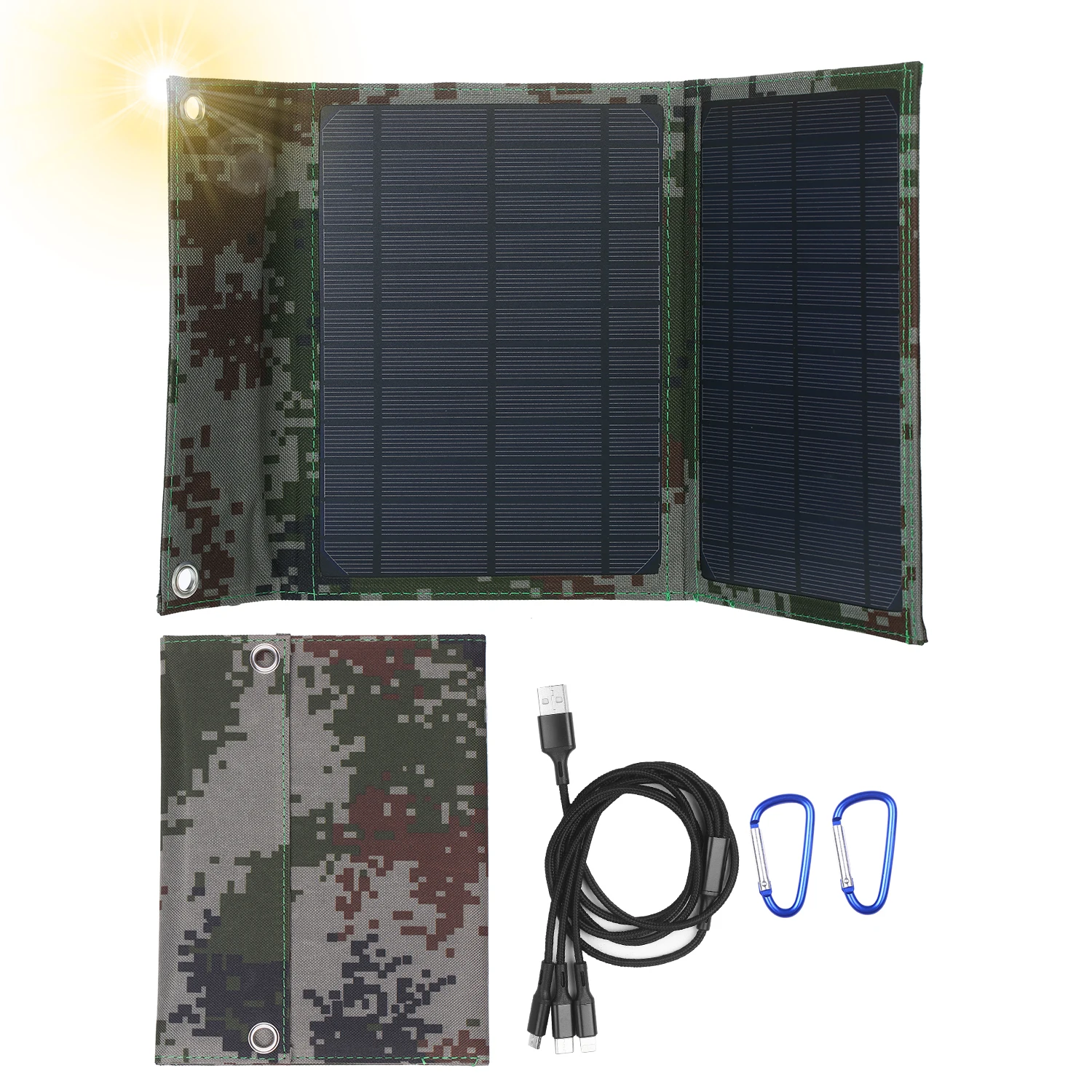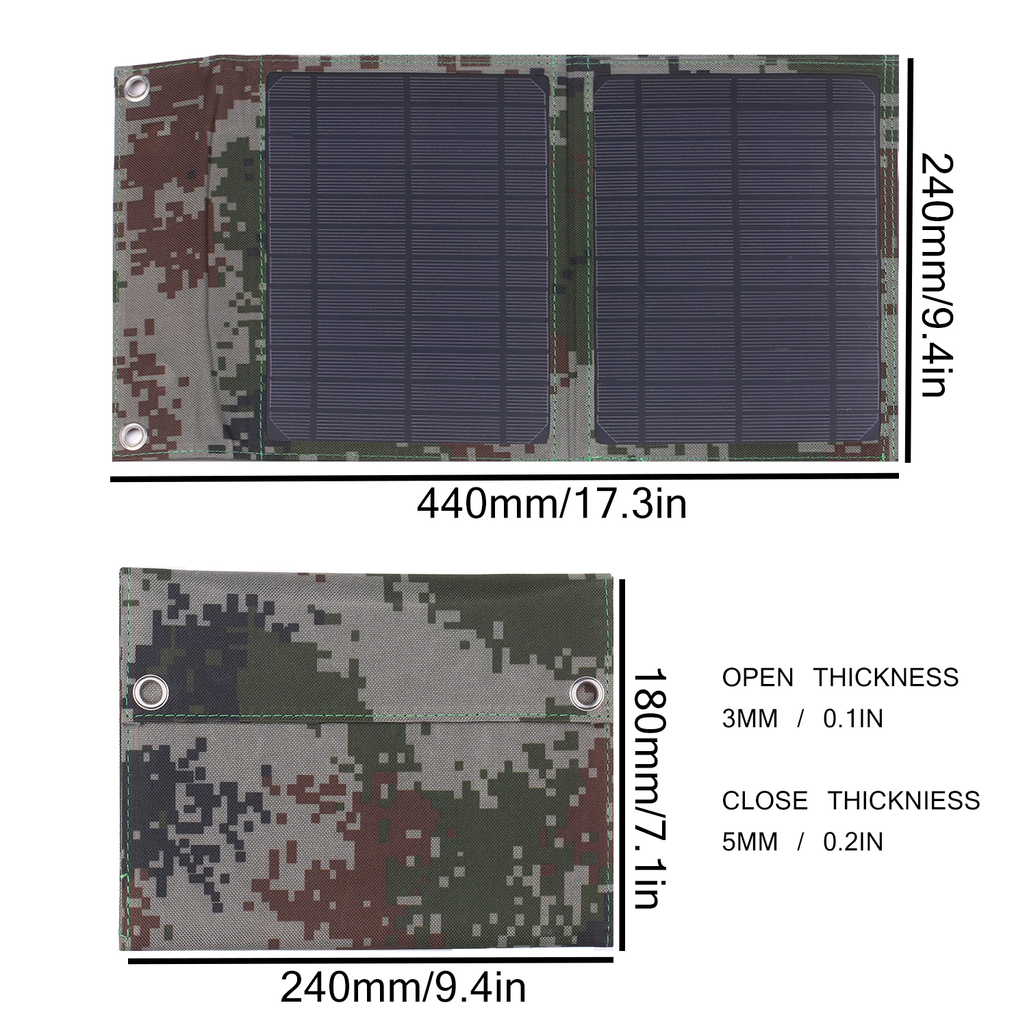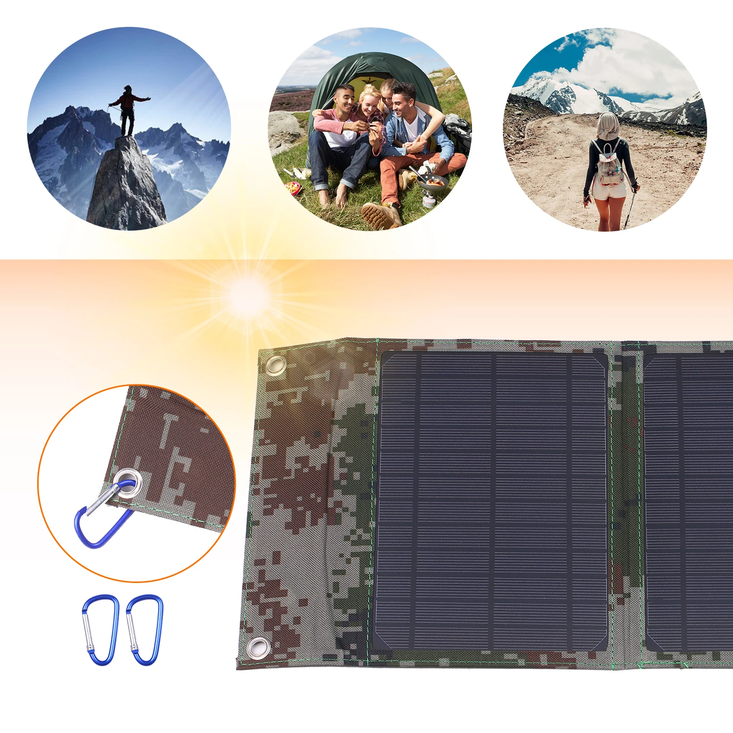Компактный легкий складной дизайн --- для ультра эластичного монвинга, камуфляжной крышки с предварительно просверленными отверстиями с 2 подвесными крючками, вы подвесили панель солнечных батарей на сумке или вашем автомобиле, надежная конструкция, легкая в транспортировке, повесить и снять.