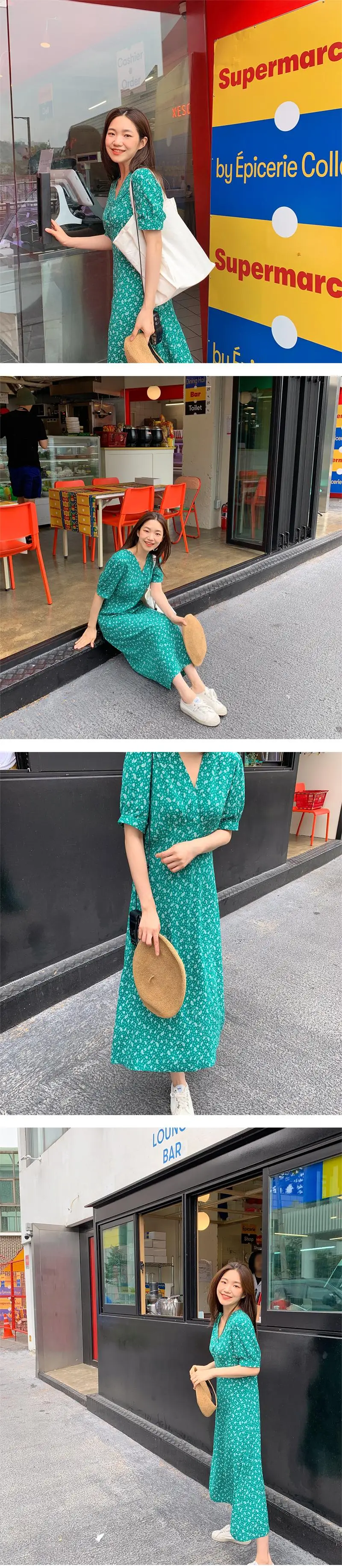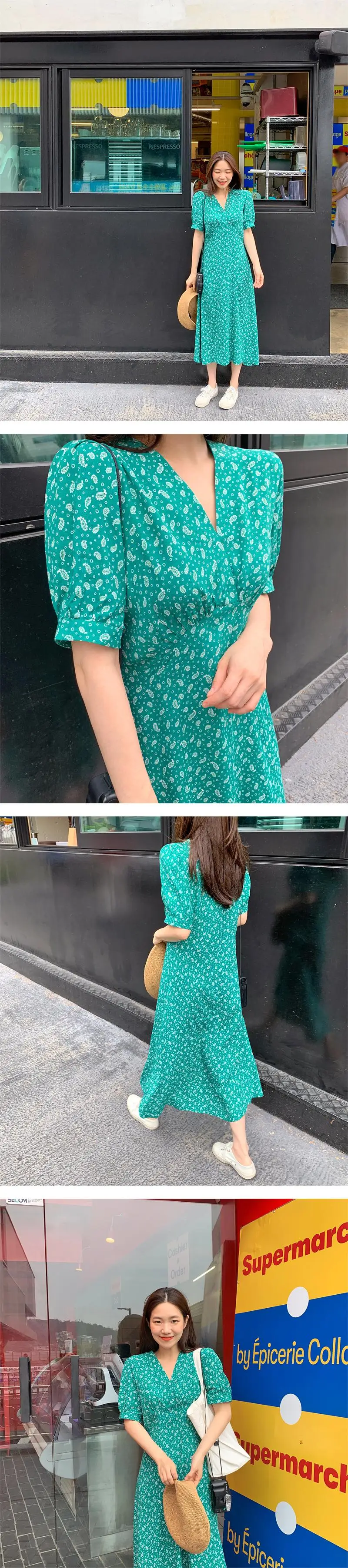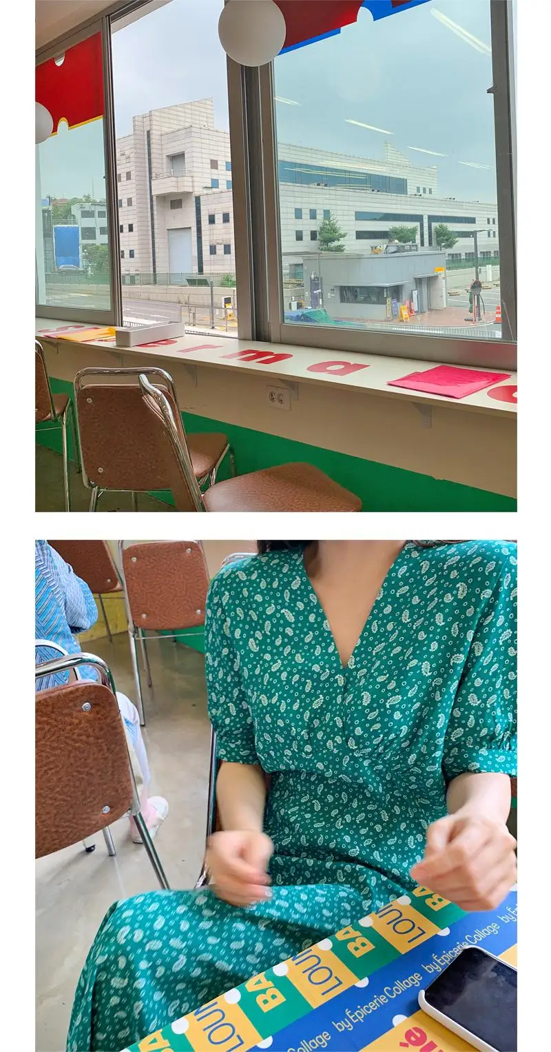 Женское винтажное платье до середины икры, повседневное свободное зеленое платье с v-образным вырезом и коротким рукавом и принтом, мода 2020