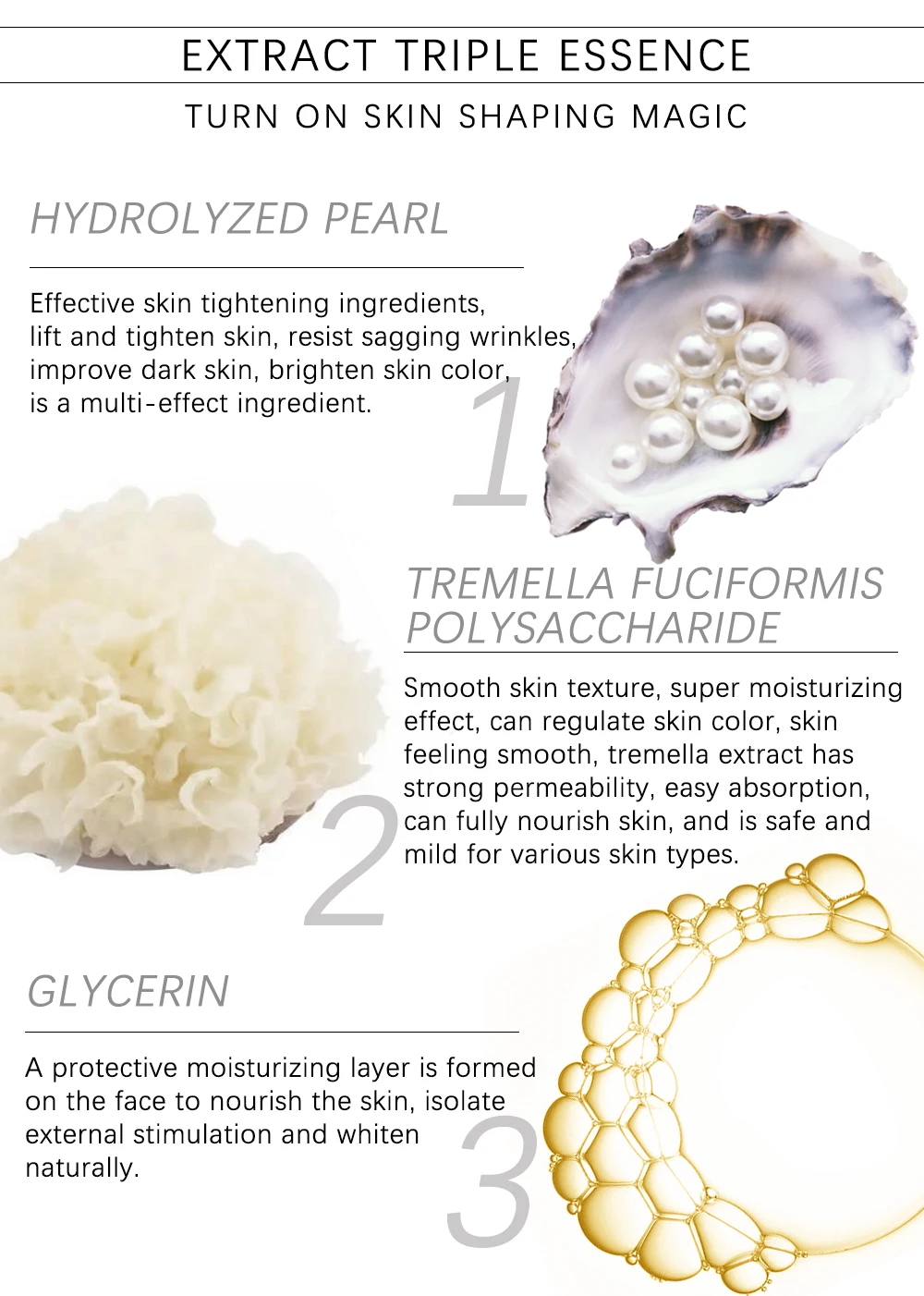 Экстракт тройной эссенция Включите магию формирования кожи Гидролизованный жемчуг Эффективные ингредиенты для подтяжки кожи, подтяжки и подтяжки кожи, защиты от провисших морщин, улучшения темной кожи, осветления цвета кожи, является ингредиентом с несколькими эффектами. Фусиформис тремелла полисахарид Гладкая текстура кожи, супер увлажняющий эффект, может регулировать цвет кожи, Ощущение гладкости кожи, экстракт тремеллы обладает сильной проницаемостью, легкое поглощение, может полностью питать кожу, И безопасен и мягкий для различных типов кожи. Глицерин Защитный увлажняющий слой формируется на лице, чтобы питать кожу, изолировать внешнюю стимуляцию и отбеливать естественным образом.