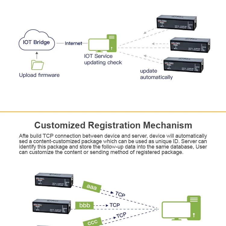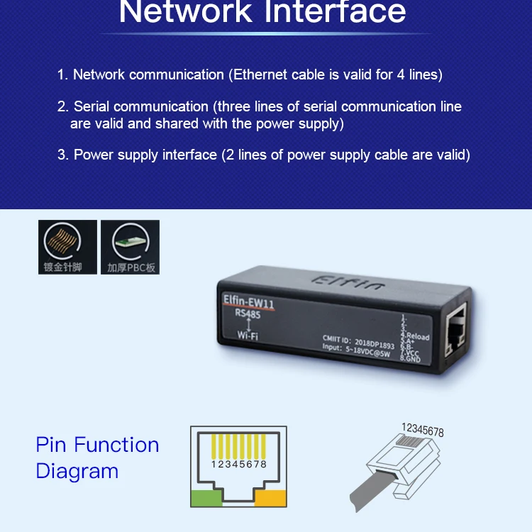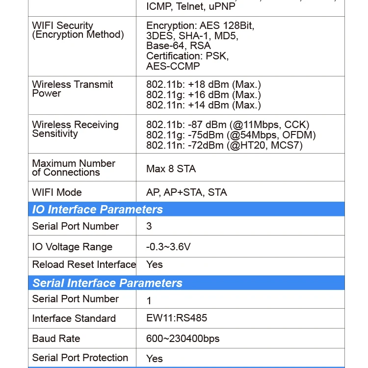 Серия Elfin-EW11 Поддерживает RS485 к WiFi, Elfin-EW1X блок является полным решением для последовательного порта устройства, подключаемого к сети. Это мощное устройство поддерживает надежную и проверенную операционную систему, хранящуюся во флэш-памяти, встроенный веб-сервер, полный стек протоколов TCP/IP и шифрование на основе стандартов (AES).