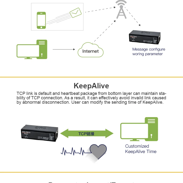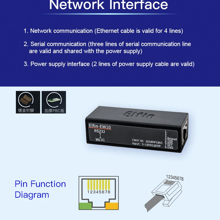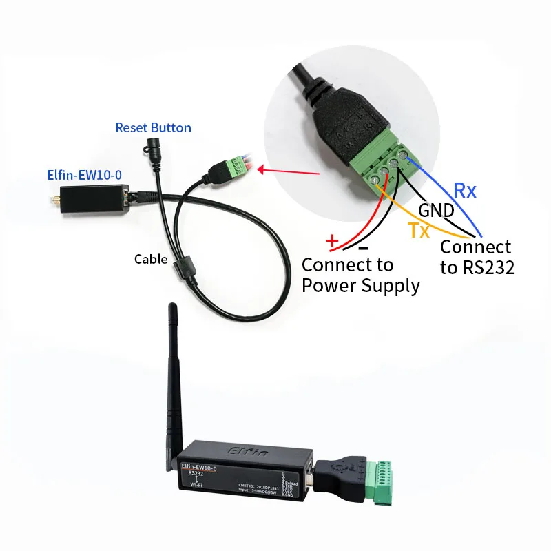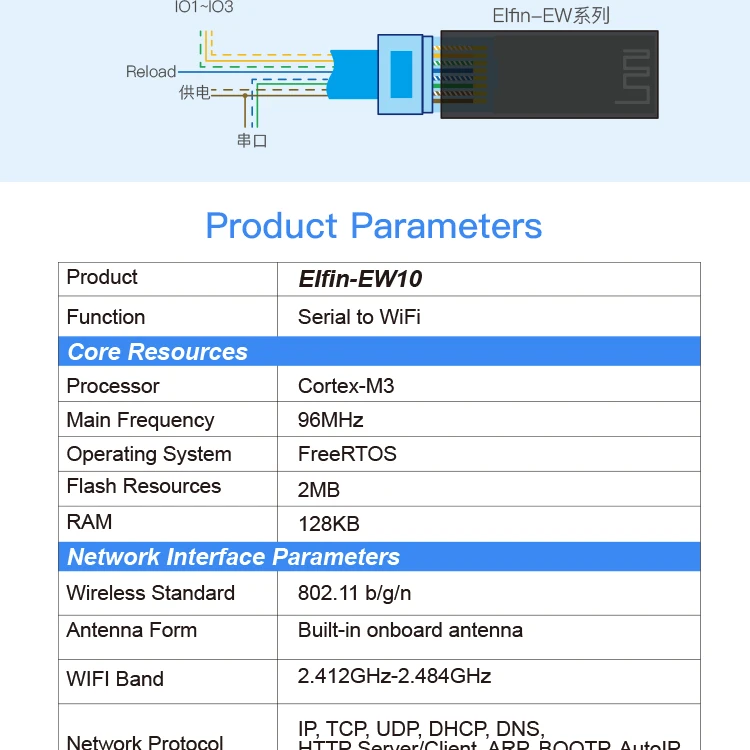 В Elfin-EW10A-0Поддержка 5 ~ 36 ВСерия поддерживает RS232 к WiFi, Elfin-EW1X блок является полным решением для последовательного порта устройства подключения к сети. Это мощное устройство поддерживает надежную и проверенную операционную систему, хранящуюся во флэш-памяти, встроенный веб-сервер, полный стек протоколов TCP/IP и шифрование на основе стандартов (AES).
