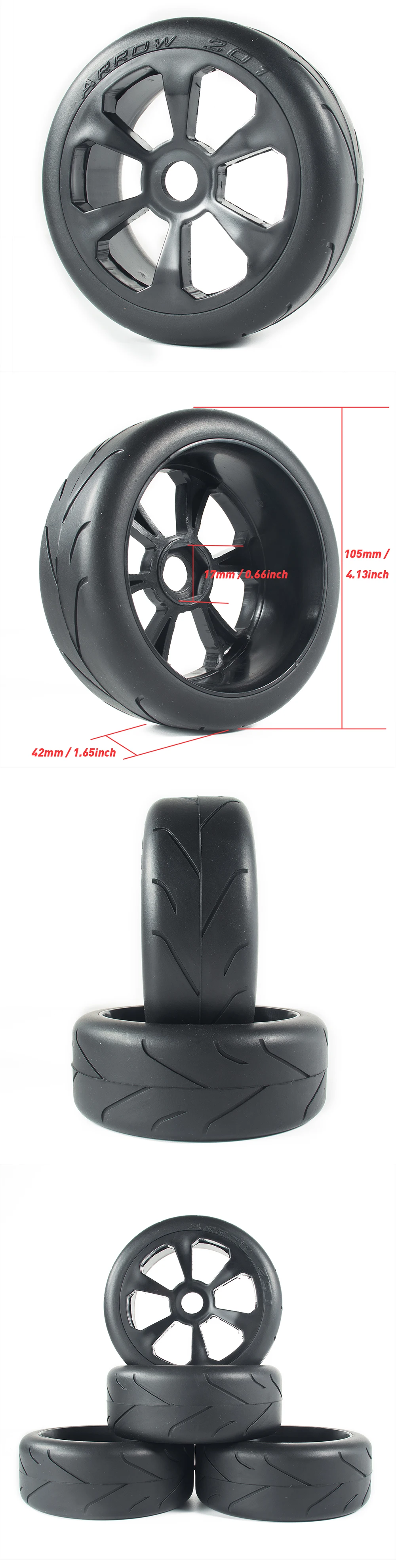 ☆ Технические характеристики: Материал шин: мягкая резина Материал обода колеса: пластик Шестигранный привод: 17 мм (не входит в комплект) Диаметр обода колеса: 82 мм Наружный диаметр шин: 105 мм Ширина: 41 мм Шины и колеса не склеены, могут быть разделены ☆ Посылка включает в себя: 4x Шины 4x колеса обода (Примечание: шины и колеса не склеены, пожалуйста, связывайтесь перед использованием) ☆ Примечание: Светильник и различные дисплеи могут привести к тому, что цвет товара на картинке немного отличается от реального. Допускается погрешность в измерениях +/- 1-3 см.