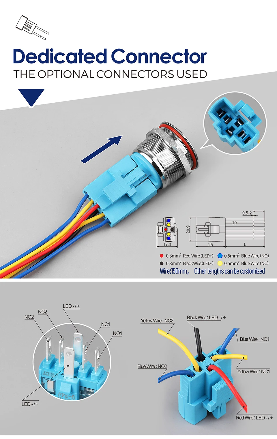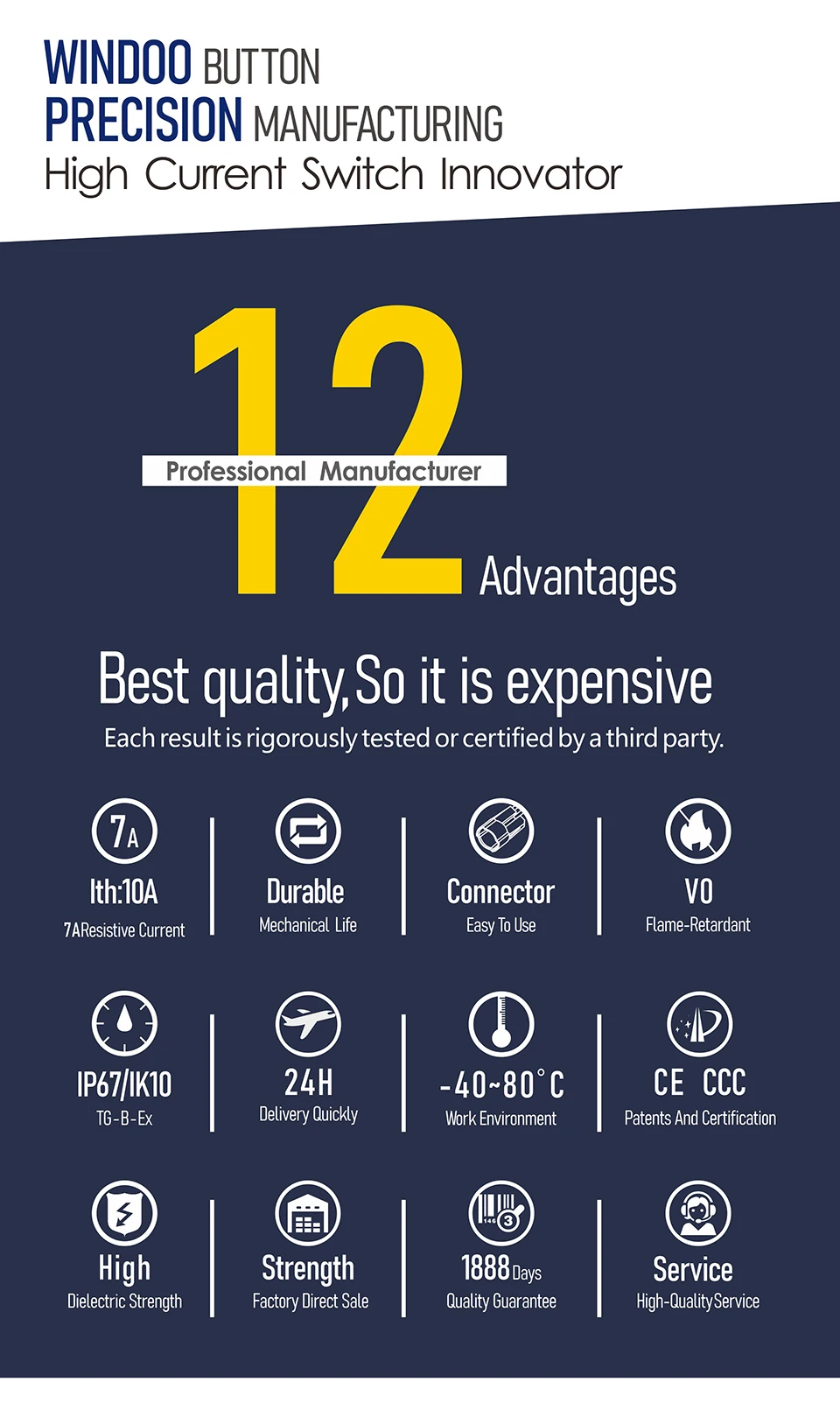1. Дополнительный разъем, чтобы обеспечить работу контакта, уменьшить отходы труда; 2. С вогнутой конструкцией, работа более удобна; 3. С супер металлической текстурой и высококачественным дизайном внешнего вида, улучшает способность противостоять сварочной деформации; 4. Водонепроницаемый и пылезащитный класс до IP67; 5. Механический срок службы: до 600000 раз, он может работать при-30 ℃ ~ 80 ℃ 6.1NO1NC функция; 7. Применяется много патентов, CCC,CE одобрено;