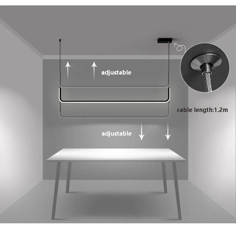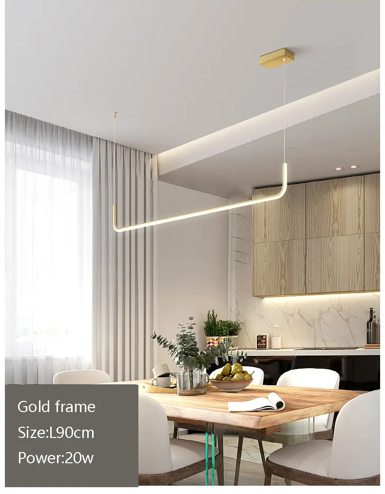 1. Вход: AC110V 220V 2. Материал: ПВХ, алюминиевый сплав, металл 3. Размер лампы L90 см Мощность: 20 Вт L120 см Мощность: 40 Вт L150 см Мощность: 40 Вт 4. Цвет корпуса: черная оправа, Золотая оправа 5. Применение: столовая, кухня, гостиная, Офисная комната, барные лампы