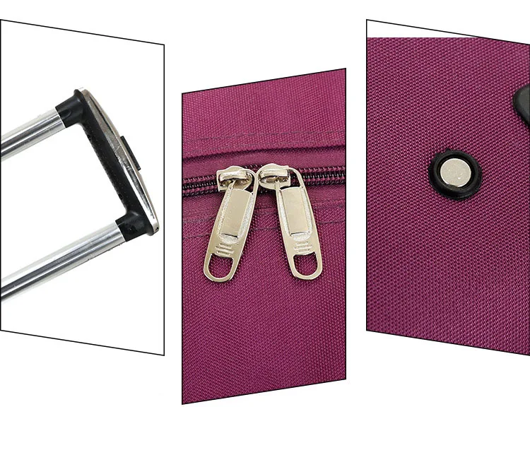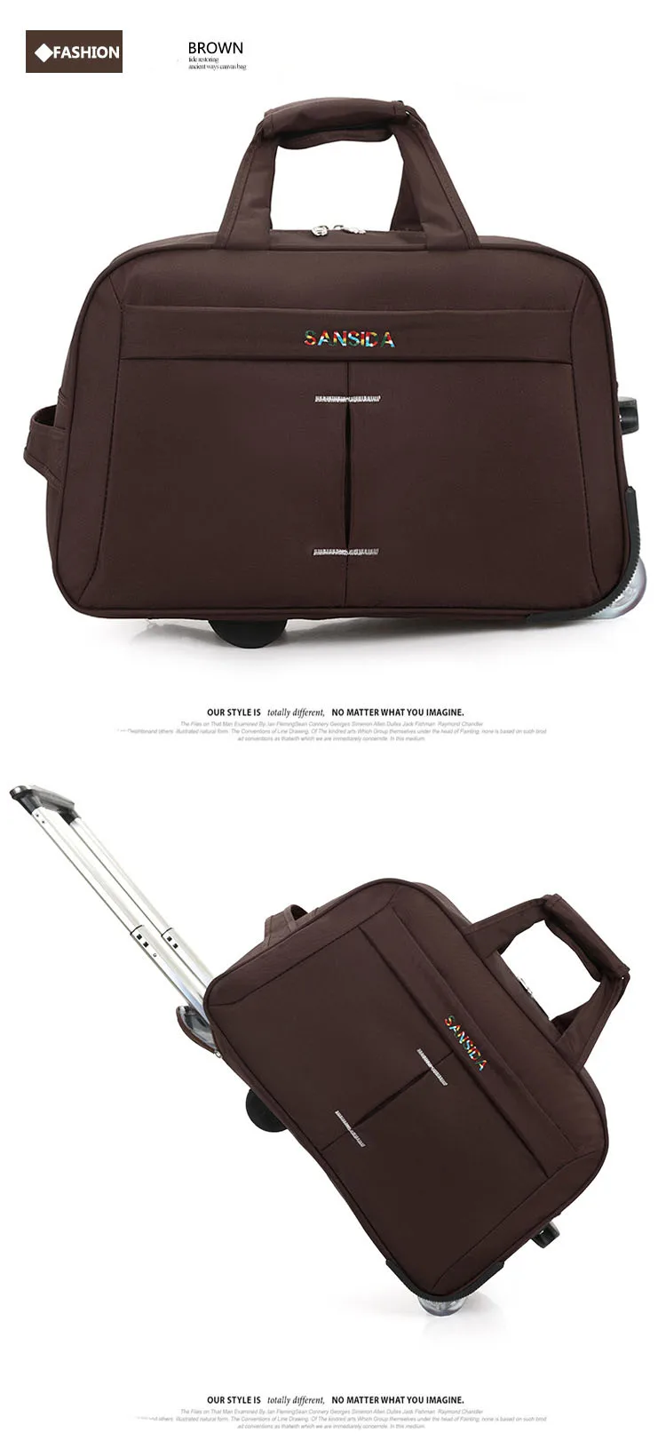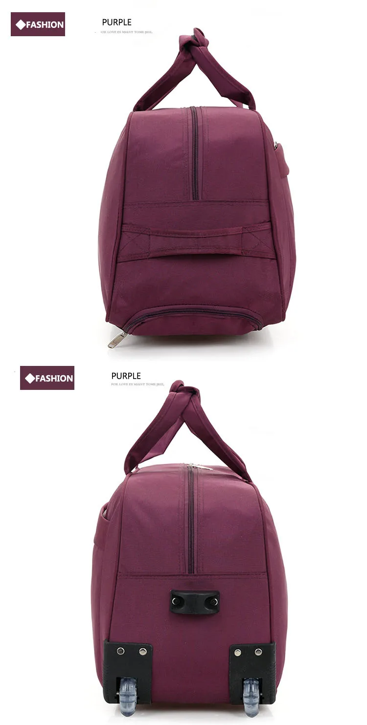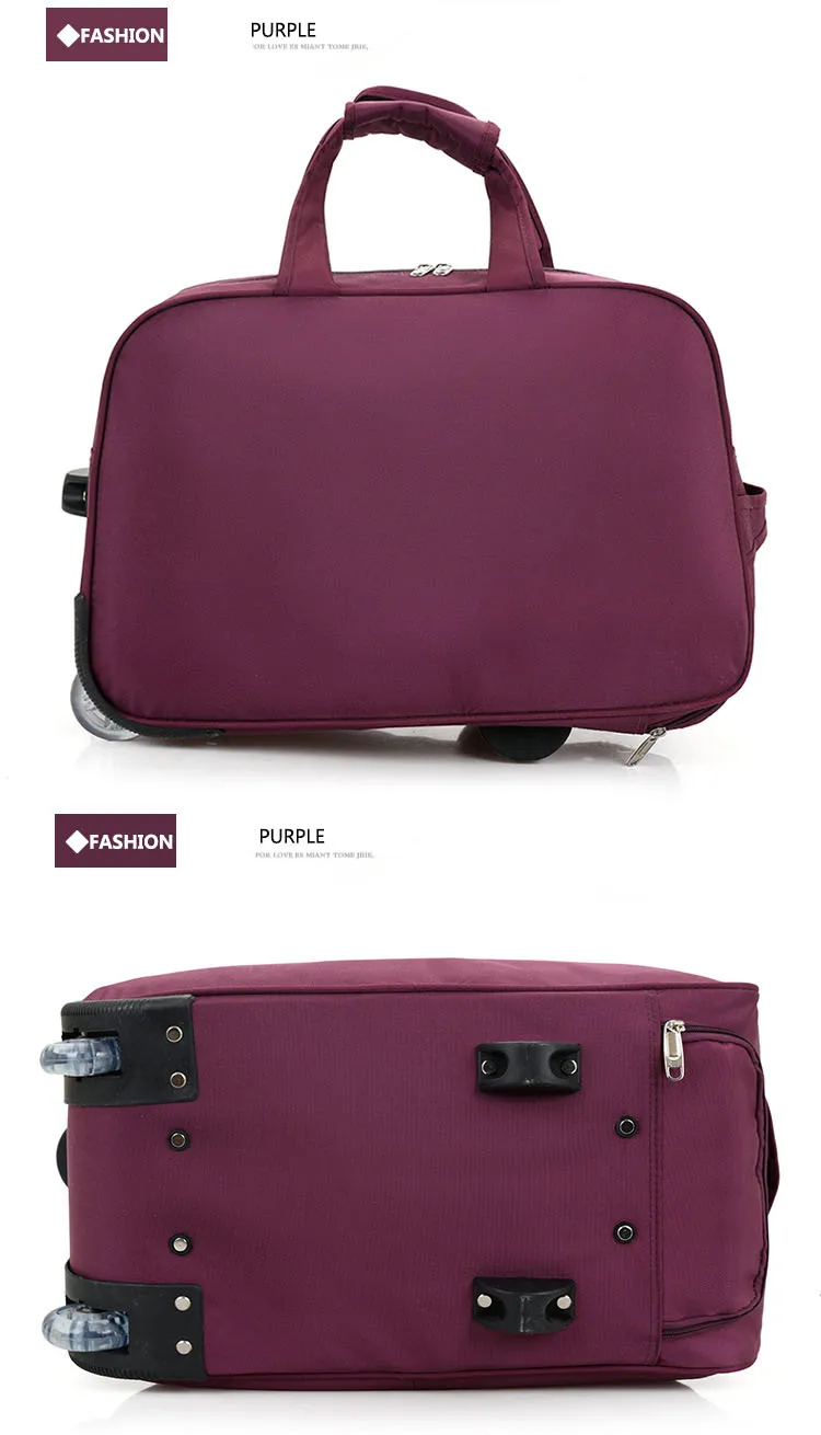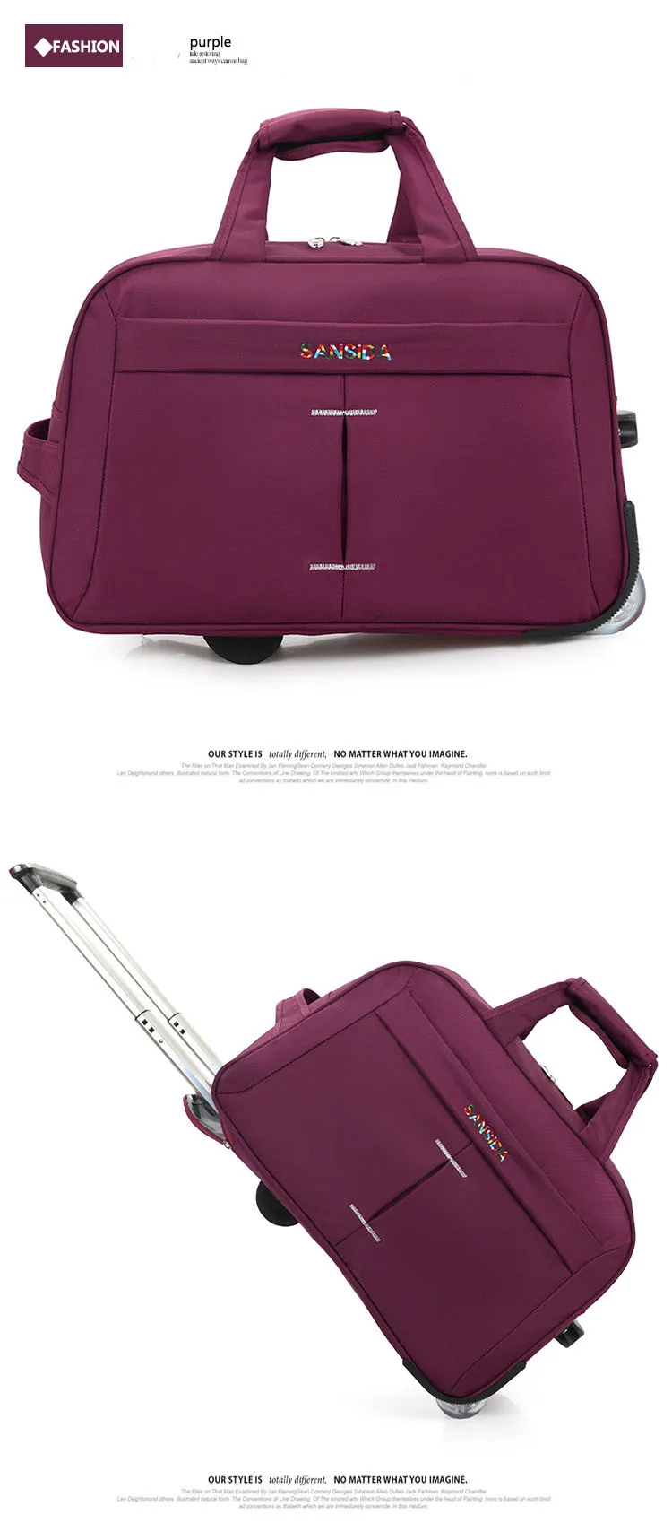Товар: Дорожная сумка-тележка Размер: 48*25*32 см Цвет: черный, коричневый, фиолетовый, красный Материал: водонепроницаемый Оксфорд, подкладка-полиэстер Особенность: многофункциональная дорожная сумка, посадка, деловая поездка, путешествия, на открытом воздухе, выходные