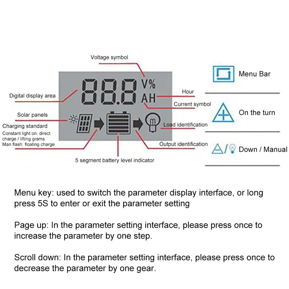 8. В соответствии с классом напряжения батареи, контроллер может автоматически устанавливать напряжение отключения заряда, напряжение выключения нагрузки, Напряжение восстановления нагрузки. (Параметр по умолчанию составляет менее 25 ℃