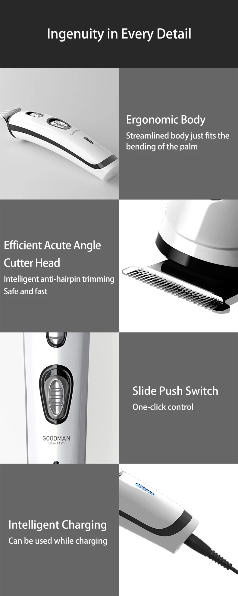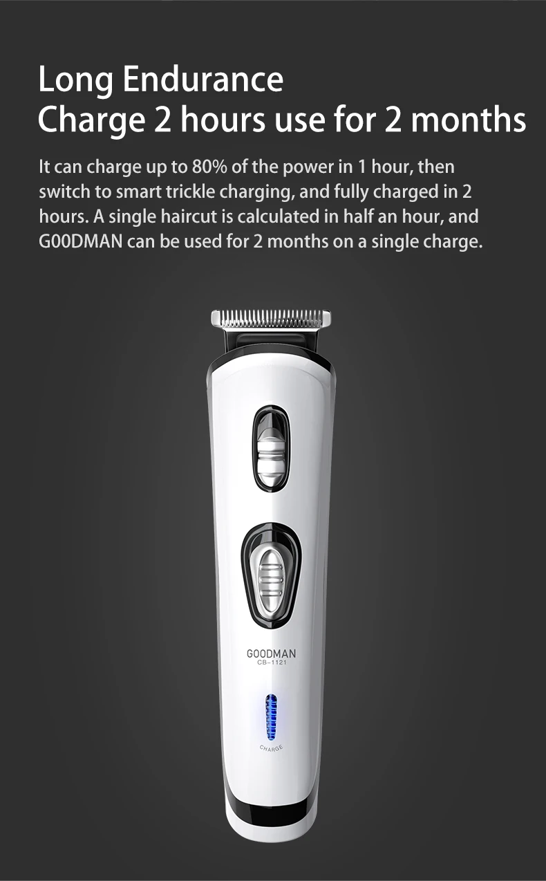 Он может заряжать до 80% мощности в течение 1 часа, затем переключаться на интеллектуальную зарядку и полностью заряжать в течение 2 часов. Одиночная стрижка рассчитывается через полчаса, а G00DMAN используется для 2 месяцев на одной зарядке.