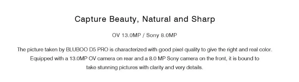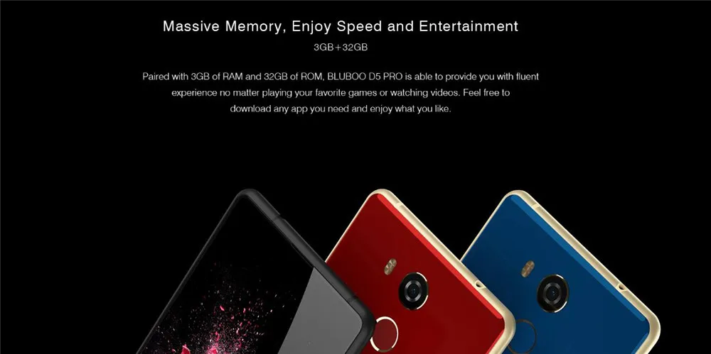Модель: Bluboo D5 Pro Размер: 146,3 мм x 71,5 мм x 8,8 мм Вес: 150 г Батарея: 2700 мА/ч, несъемный литий-ионный полимерный аккумулятор Батарея, 4,35 V батарея core, поддержка 5V/1.5A заряжен Systerm: MTK6737 Quad-core 1,3 ГГц Android 7,0 Nougat ОЗУ + ПЗУ: 3 ГБ + 32 ГБ Сим-карты: Две сим-карты, двойной режим ожидания Micro Sim + Nao Sim / TF 0,1 s задний дактилоскопический Tri-bezzel уменьшенного использования пластин полноэкранный дизайн Металлический каркас Цвет: черный/красный/синий Задние камеры 8.0MP AF(SW:13.0MP)t Фонарик: Поддержка Фронтальная камера 5.0MP FF(SW:8.0MP) Дисплей Размеры: 5,5 "IPS Разрешение: 640x1280P TP : G + F технологии, двойной-touch support, латексные перчатки/влажными руками управления Датчики давления G-sensor Датчик отпечатков пальцев Ускоритель Тип сети GSM: B5(850)/B8(900)/B3(1800)/B2(1900) WCDMA: B1(2100)/B5(850)/B8(900) LTE-FDD:B1/B3/B7/B8/B20 Беспроводная передача данных WI-FI: 802.11a/n/b/g/ac WI-FI компиляция java-приложений!/WI-FI: Поддержка Версия Bluetooth: 4,0 GPS : GPS + A-GPS Поддерживаемый формат Видео: MP3, AAC,ASF и т. д SD карты памяти: до 256GB MicroSD (TF) расширение OTG: Поддержка Аудио MP3, AAC,ASF и т. д Fm-радио: Поддержка Наушники Порты и разъёмы: 3,5 мм Стандартный Интерфейс