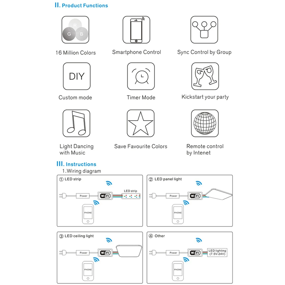 Этот контроллер предназначен для светодиодный ленты, модуля и т. Д. После того, как легкая установка и настройки Вы сможете использовать телефон (для системы IOS или Android) для управления светильник.