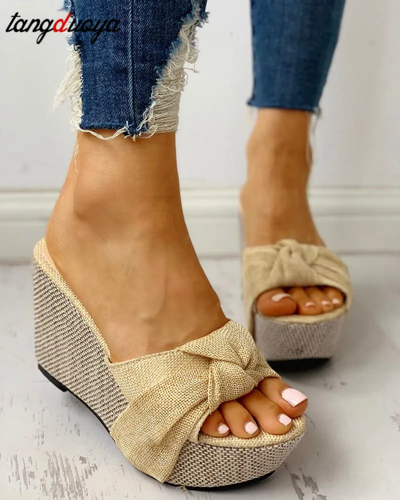 Летние пикантные сандалии для отдыха на платформе без застежки с бантом; Женская обувь на танкетке и высоком каблуке; Женские шлепанцы; Вьетнамки; Zapatos de mujer; 2020