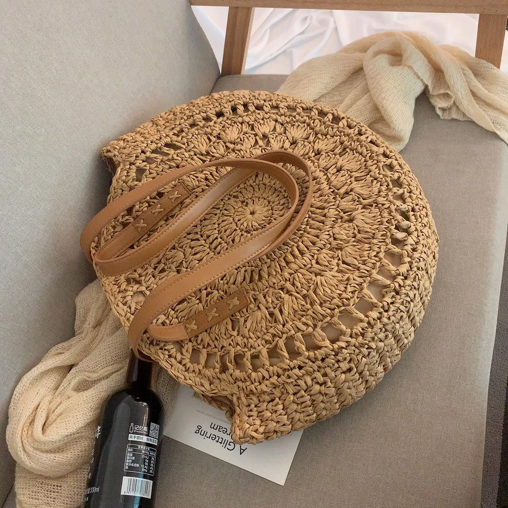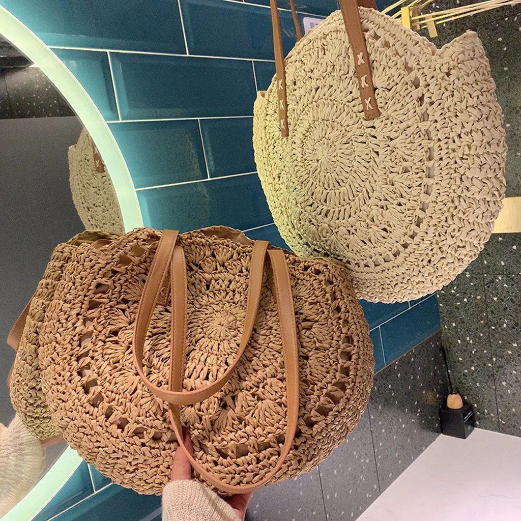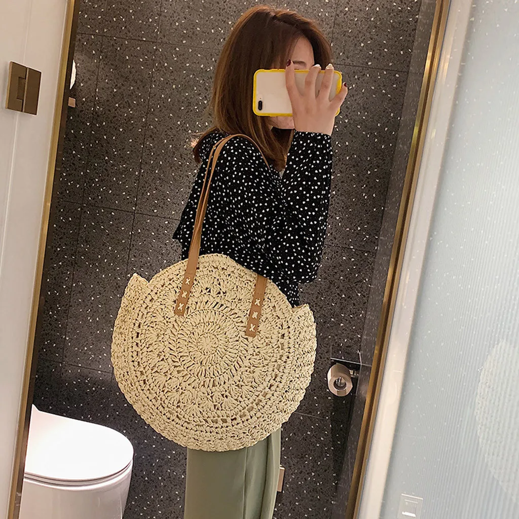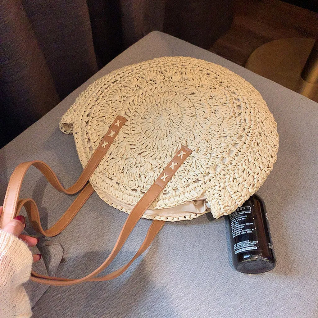 Круглая Соломенная пляжная сумка, винтажная плетеная сумка на плечо ручной работы, Круглые Цветочные плетеные сумки из ротанга, богемные летние пляжные повседневные сумки для отдыха