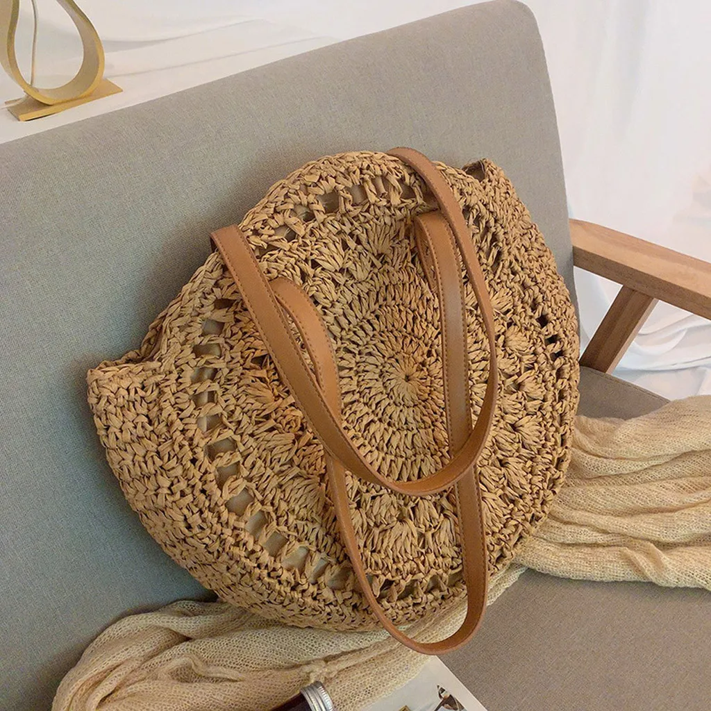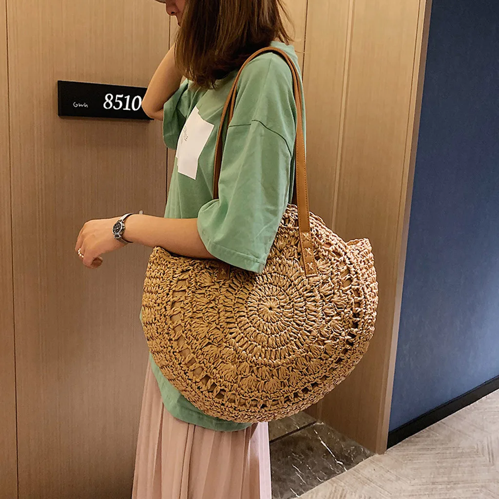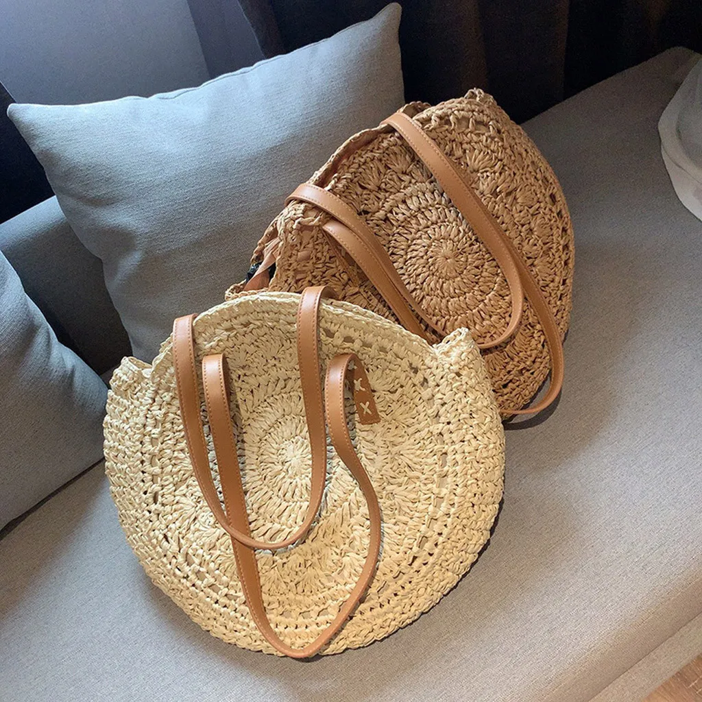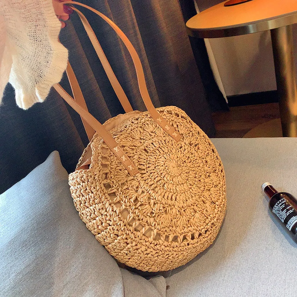 Круглая Соломенная пляжная сумка, винтажная плетеная сумка на плечо ручной работы, Круглые Цветочные плетеные сумки из ротанга, богемные летние пляжные повседневные сумки для отдыха