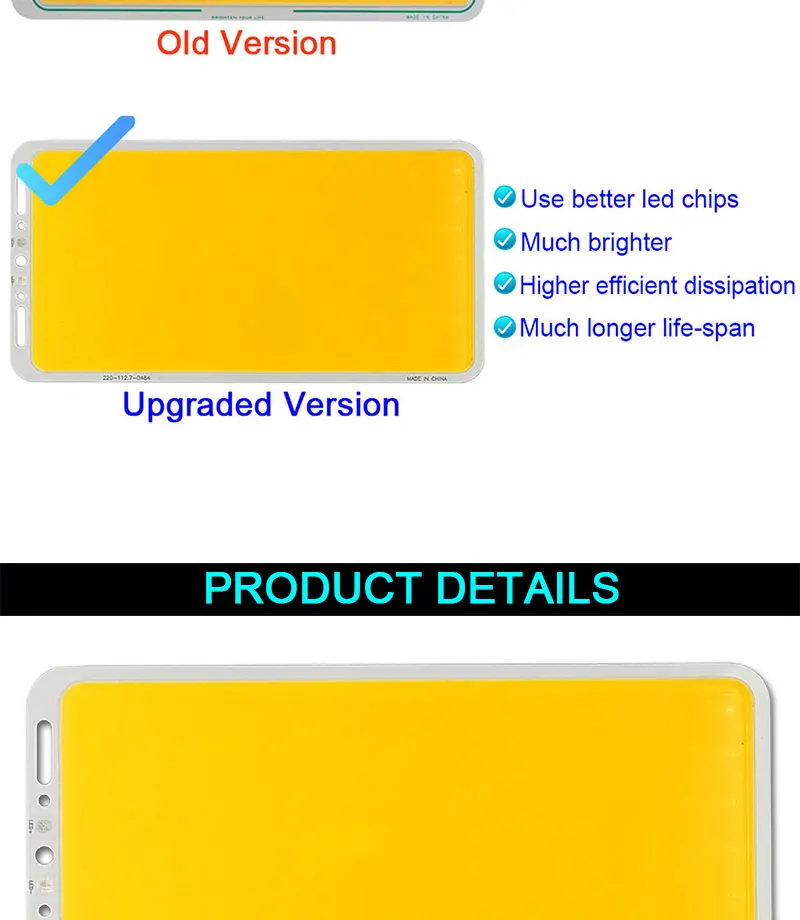 Название продукта: COB светодиодный Панель Размер светодиосветодиодный COB: 220*113 мм Диаметр излучения: 203*100 мм Мощность: 100 Вт Напряжение: 12-14 В постоянного тока или 24-27 В постоянного тока Цвет излучения: холодный белый (6000-6500K), теплый белый (2800-3200K) RA: 80 Водонепроницаемость: Да Светоотдача: >120 лм/Вт Расстояние дистанционного управления: около 20 метров Применение: наружное освещение, внутреннее освещение, освещение для кемпинга, автомобильное освещение, другие лампы «сделай сам»