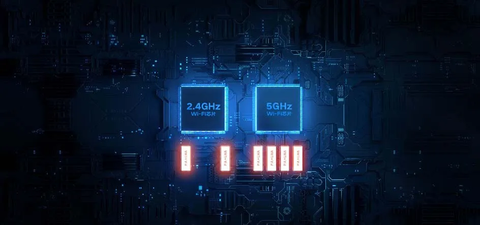 6 высокопроизводительный внешний усилитель сигнала 2,4 ГГц и 5 ГГц Диапазон оснащены от двух до четырех внешний высокопроизводительный усилители сигнала (PA + LNA), соответственно. PA (усилитель мощности) эффективно увеличивает мощность передачи сигнала, делая сигнал, передаваемый маршрутизатором, все дальше и сильнее через стену. LNA (усилитель с низким уровнем шума) Чувствительность приема сигнала может быть улучшена, так что маршрутизатор может быть подключен для получения более слабых сигналов.