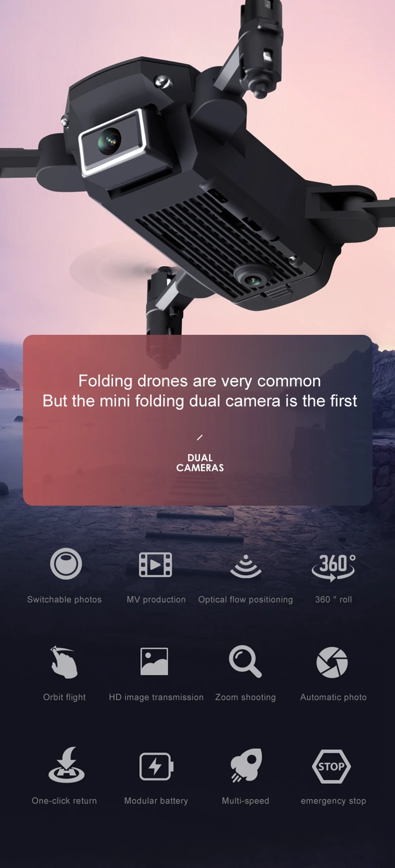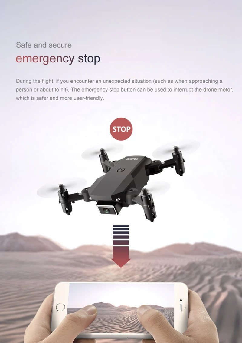 Функции: вверх/вниз, вперед/назад, влево/вправо, боковой полет, светодиодный свет, Безголовый режим, автоматическое возвращение одной кнопкой, режим удержания высоты, WiFi FPV. Визуальное позиционирование. Переключение камеры.