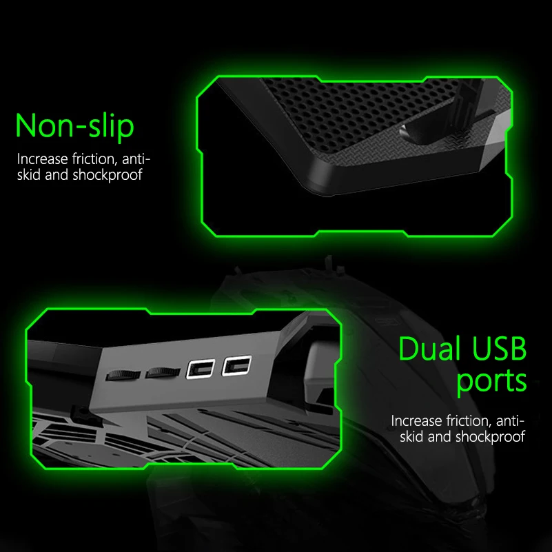 Размер продукта 413*288*32 мм Размер вентилятора 100*100*20 мм (5 шт.) Скорость вентилятора 1400 ± 10% об/мин Номинальное напряжение 5VDC Номинальный ток 0.9а ± % Вход мощность 4,5 W Цвет: красный/зеленый USB Порты и разъёмы: 2 Охлаждающая подставка для ноутбука подходит для ноутбука 12-17 дюймов/регулируемый светильник/Нескользящий/эргономичный дизайн