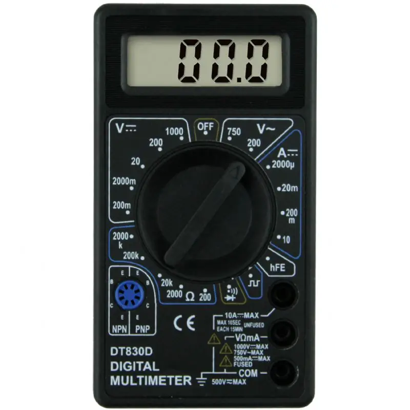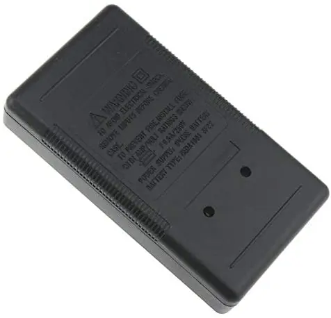 ЖК-дисплей Размер: 49x16mm Максимальный размер дисплея: 1999 Индикация низкого заряда батареи: Да Защита от перегрузки: Да Диодный Тест: Да Тест на Транзистор: да Тест зуммера непрерывности: Да Квадратный волновой выход: Да Мощность питания: один 9V 6F22 батарея Размер продукта: 125 × 70 × 25 мм Вес изделия: около 111 г Стандартные аксессуары: счетчик (с аккумулятором), тестовый свинец, руководство