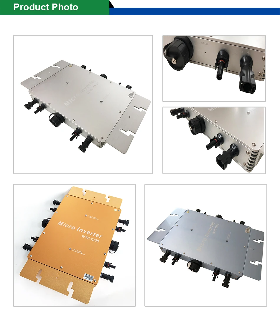 Микроинвертор WVC1200Использование водонепроницаемого обтекаемого дизайна IP65 позволяет эффективно предотвращать эрозию дождевой воды на поверхности, встроенная высокопроизводительная функция отслеживания максимальной мощности (MPPT), лучше отслеживать изменения солнечной яркости и контролировать различную выходную мощность, эффективно улавливать и собирать солнечный свет. Передача электрической энергии переменного тока с использованием технологии обратной передачи, является одной из наших запатентованных технологий, выходная мощность инвертора может обеспечить приоритетное использование нагрузки, дополнительное электричество в сетку, эффективное использование инвертора к излучаемой мощности, скорость передачи электроэнергии до 99%. 22-50VDC Диапазон входного напряжения подходит для солнечных панелей 30 в (60 ячеек) или 36 В (72 ячейки). Высокая производительность максимальное отслеживание точки мощности (MPPT) Реверсивная передача мощности Интеллектуальное управление мониторингом Входное/выходное напряжение электропитания полностью изолировано для защиты электрической безопасности Комбинированная параллельная укладка Система цифрового управления с цифровым индикатором Облегчение технического обслуживания (пользовательский сервис) Низкие эксплуатационные и эксплуатационные расходы Гибкая установка на колесиках Беспроводное подключение 433 / 462 МГц|
