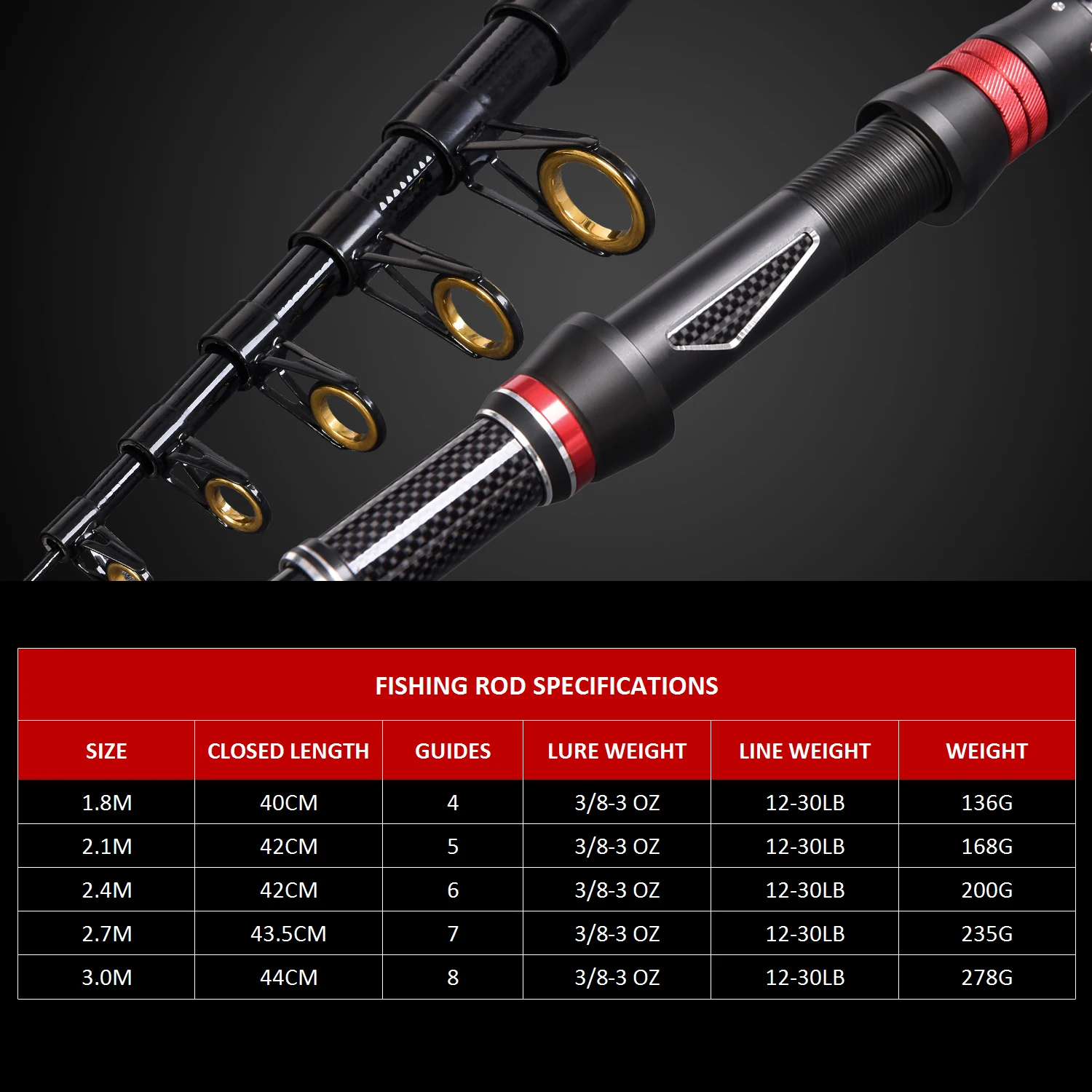 Телескопическая удочка: изготовлена из углеродного волокна высокой плотности, Удочка легкая и прочная. Он Телескопический и Закрытая длина делает его очень удобным для переноски.