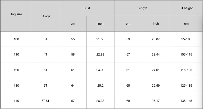 1. Пожалуйста, выберите размер в соответствии с фактическим размером ребенка 2. Поскольку размеры тела каждого ребенка различаются, возраст, рост, вес и другие параметры приводятся только для справки 3 размера, генерируемые нормальным диапазоном погрешности 1-3 см