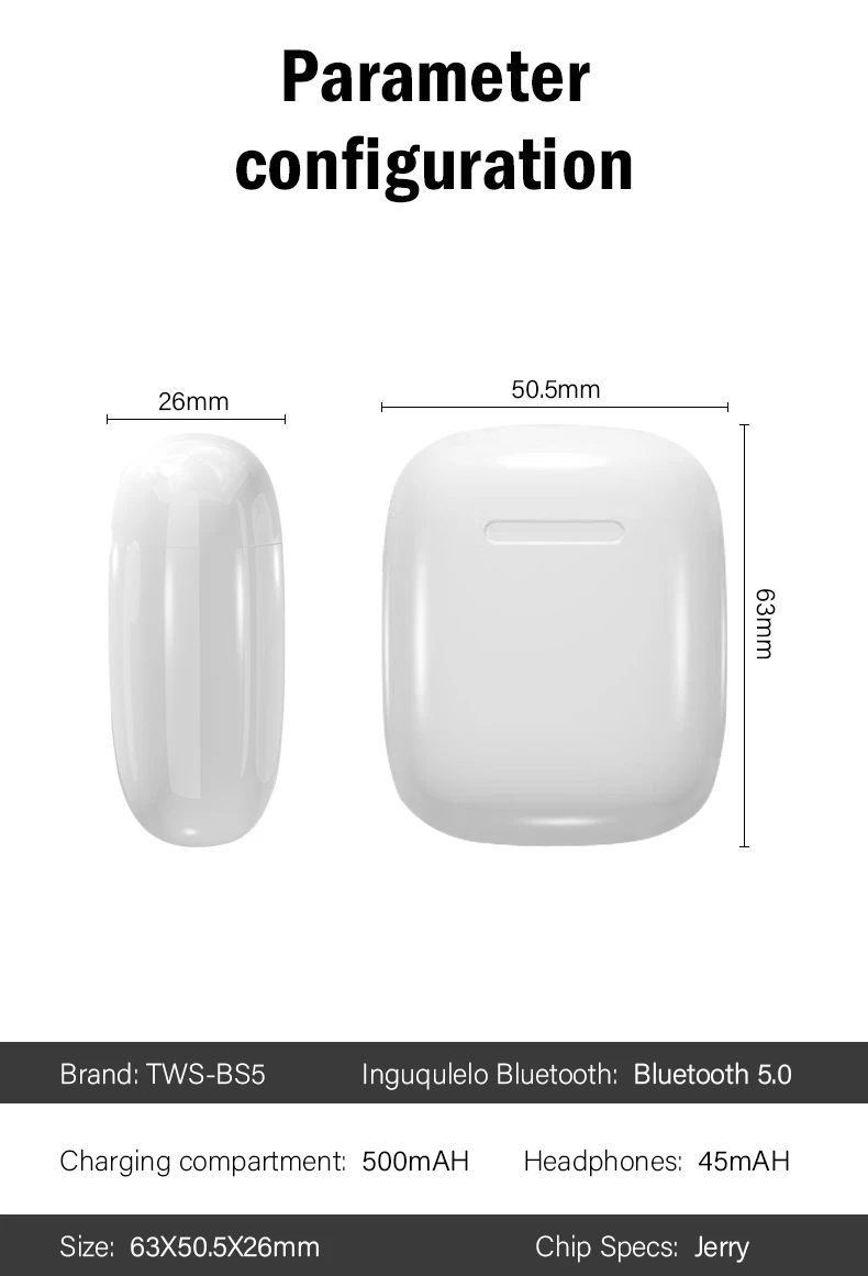 Продукт Особенности: Автоматическое Сопряжение: 1. Извлеките наушники влево и вправо (LR) из зарядный чехол. Уши будут автоматически включаться и подключаться (красный и синий светильник мигает отдельно). 2. Откройте мобильный телефон Поиск Bluetooth, нажмите на имя основной пары уха (BS5) для подключения. 3. Они будут автоматически подключаться к вашему bluetooth-устройству при повторном использовании 4. Эти беспроводные наушники также могут быть одним подключением. ♦Истинный беспроводной стерео, левый и правый канал разделения, HIFI звук. ♦И левый, и правый уши имеют полную функцию bluetooth-гарнитуры, которая может использоваться отдельно или в паре. ♦Двойной режим Bluetooth 5,0, Ультра низкое энергопотребление. ♦Расстояние передачи Bluetooth: 10 метров. ♦Время прослушивания песни: около 5 часов для одного уха и около 3-4 часов для обоих. ♦Емкость аккумулятора (зарядный чехол): Внутренняя перезаряжаемая батарея емкостью 500 мАч. ♦Время работы в режиме ожидания: около 200 часов. ♦Протокол поддержки: A2DP1.3/HFP1.6/HSP1.2/AVRCP1.6/DI1.3. ♦Технология шумоподавления: CVC6.0. Посылка включает в себя: 1 * пара беспроводных наушников BS5 TWS 1 * зарядный чехол 1 * кабель типа C-USB 1 * Руководство пользователя